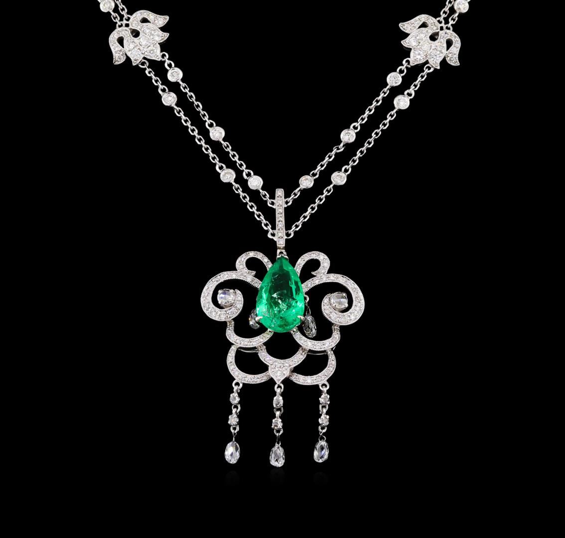 One electronically tested 18KT white gold ladies cast & assembled emerald and diamond necklace. Sixteen inch length necklace features an attached pendant consisting of an emerald set within an elaborate intertwining diamond set floral gallery with diamond briolette drops, completed by a double sided diamond set bail. The necklace is supported by a double strand diamond station chain with two diamond set lotus flower designs, terminating in a lobster claw clasp with a two inch length extension. Bright polish finish with milgrain detailing. Identified with markings of "750". Condition is good. Containing: One prong set pear mixed cut natural emerald, measuring 13.40 x 8.00. x 4.65mm, 6%. bulge factor, approximate weight of 2.90ct., clarity is moderately included, type III, medium dark, moderately strong, very slightly bluish green color, (GIA vslbG 6/4), cut is good. Transmitting light with a minimum of distortion, transparent. Naturally occurring internal & external characteristics are present. Indications of oil residue. Graded in the setting. Two prong set rose cut diamonds, measuring 2.90 - 2.80 x 0.80mm (depth est.) approximate total weight of 2 Stones = 0.06ct. Graded in the setting. Clarity: SI-1 . Color: H Six prong set rose cut diamonds, measuring 1.50 - 1.40 x 0.70mm (depth est.) approximate total weight of 6 Stones = 0.04ct. Graded in the setting. Clarity: SI-1 to SI-2 . Color: G - H Five briolette cut diamonds, measuring 4.00. x 2.30 x 2.00.mm (depth est.) approximate total weight of 5 Stones = 0.65ct. Measurements are an average for the group. Graded in the setting. Clarity: SI-1 to SI-2 . Color: G - H Thirty-Five prong & bezel set round brilliant cut diamonds, measuring 1.80 - 1.40 x 0.96mm (depth est.) approximate total weight of 35 Stones = 0.62ct. Graded in the setting. Clarity: SI-2 to I-1 . Color: G - I One Hundred Twenty prong set round brilliant cut diamonds, measuring 1.00. - 0.90 x 0.57mm (depth est.) approximate total weight of 120 Stones = 0.47ct. Graded in the setting. Clarity: SI-1 to SI-2 . Color: G - I. Total Weight of Colored Stones 2.90ct.. Total Weight of Diamonds 1.84ct.. Total Weight of Necklace 15.44gm. AIG Appraised at $16,420.00.