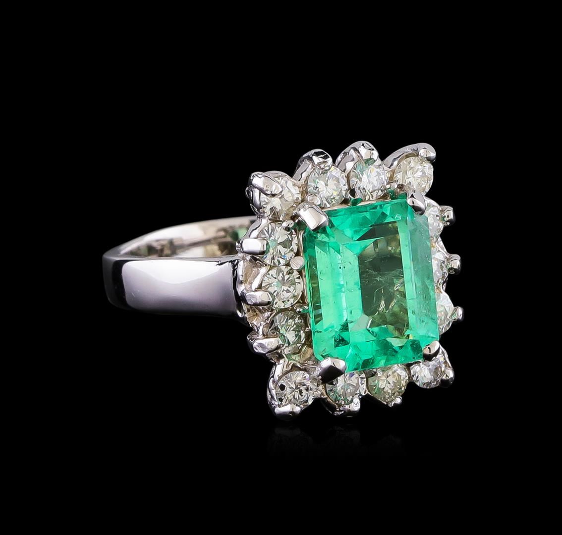 One electronically tested 14KT white gold lady's cast fashion ring with a cathedral basket halo with a bright polish finish. The featured lady's has a shank measuring 3.18 millimeters in width. Identified with markings of "14K". Condition is new, good workmanship. Containing: One prong set emerald step cut natural emerald, measuring 9.65 x 8.03 x 5.24mm, (depth est.) approximate weight of 2.90ct., clarity is slightly included, medium, moderately strong, green color, (GIA G 5/4), cut is very good. Transmitting light with a minimum of distortion, transparent. Indications of oil residue. Naturally occurring internal & external characteristics are present. Colored gemstones are presumed to have been subjected to commonly used enhancement processes. Graded in the setting. Fourteen prong set round brilliant cut diamonds, measuring 2.60 - 2.50 x 1.57mm (depth est.) approximate total weight of 14 Stones = 0.88ct. Graded in the setting. Clarity: VS-2 to SI-2. Color: H - I. Cut Good. Total Weight of Colored Stones 2.90ct. Total Weight of Diamonds 0.88ct. Total Weight of Ring 6.50gm. GAS Appraised.