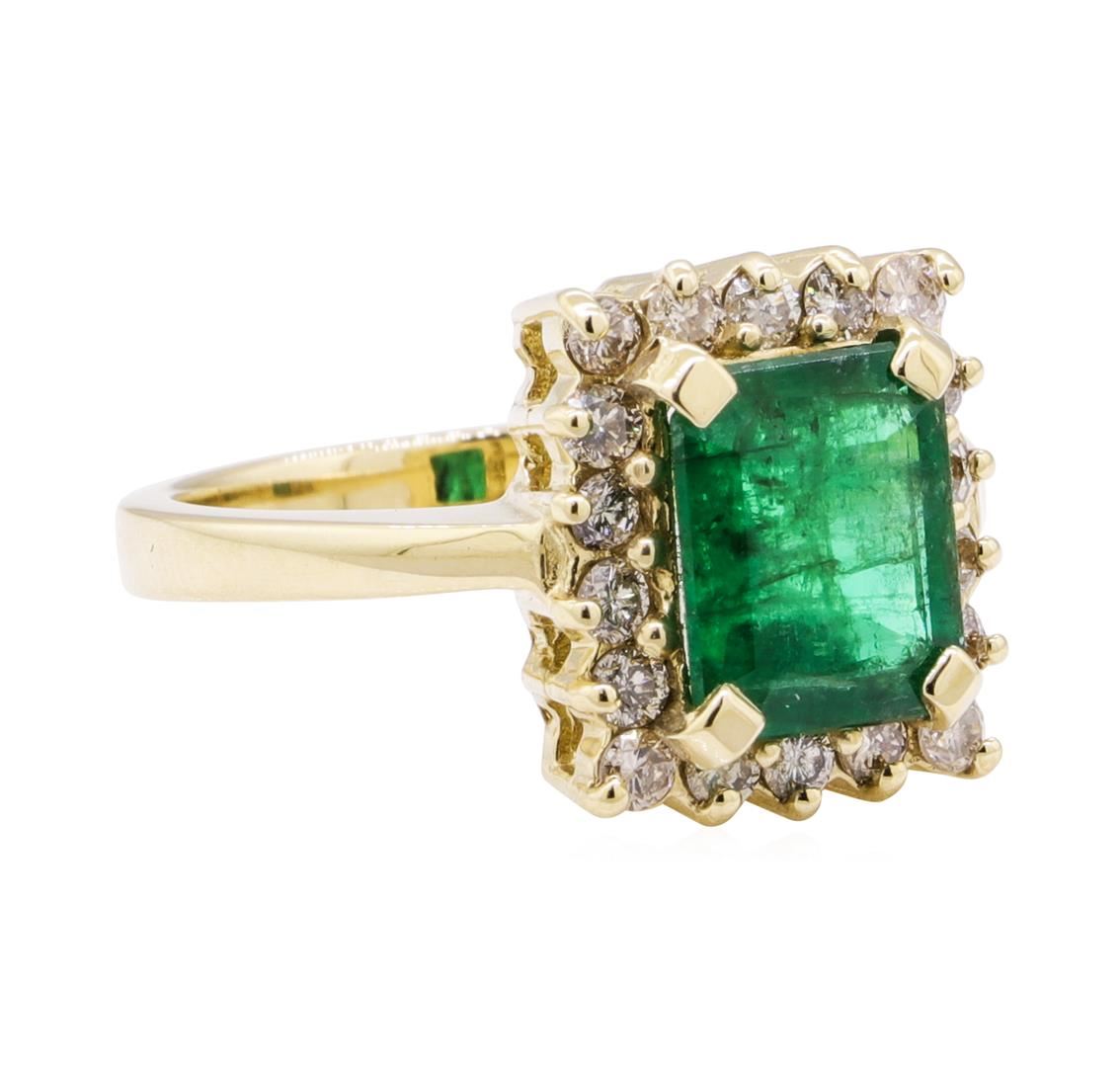 One electronically tested 14KT yellow gold lady's cast fashion ring with a basket halo with a bright polish finish. Condition is new, good workmanship. The featuredlasy's ring has a shank measuring 2.50 millimeters wide. Identifies with markings of "K14". Containing: One prong set emerald standard step cut natural emerald, measuring 9.01x7.37x4.57mm (depth est.) 3% bulge factor, approximate weight of 2.30 ct., clarity is heavily included, meduim dark, strong, green color, (GIA G6/5), cut is good. Transmitting light somewhat diffusely, semi-transparent to translucent. Naturally occuring internal & external characteristics are present. Indications of oil residue. Colored gemstones are presumed to have been subjected to commonly used enhancment processes. Graded in the setting. Eighteen prong set round brilliant cut diamonds, measuring 2.10-2.00x1.27mm (depth est.) approximate total weight of 18 stones=0.60 ct. graded in the setting. Clarity SI-1 to I1. Color J-k. Cut good. Total weight of colored stones 2.30 ct. Total weight of diamonds 0.60 ct. Total weight of ring 6.10gm. Total estimated retail value $5875.00 GAS Appraised.