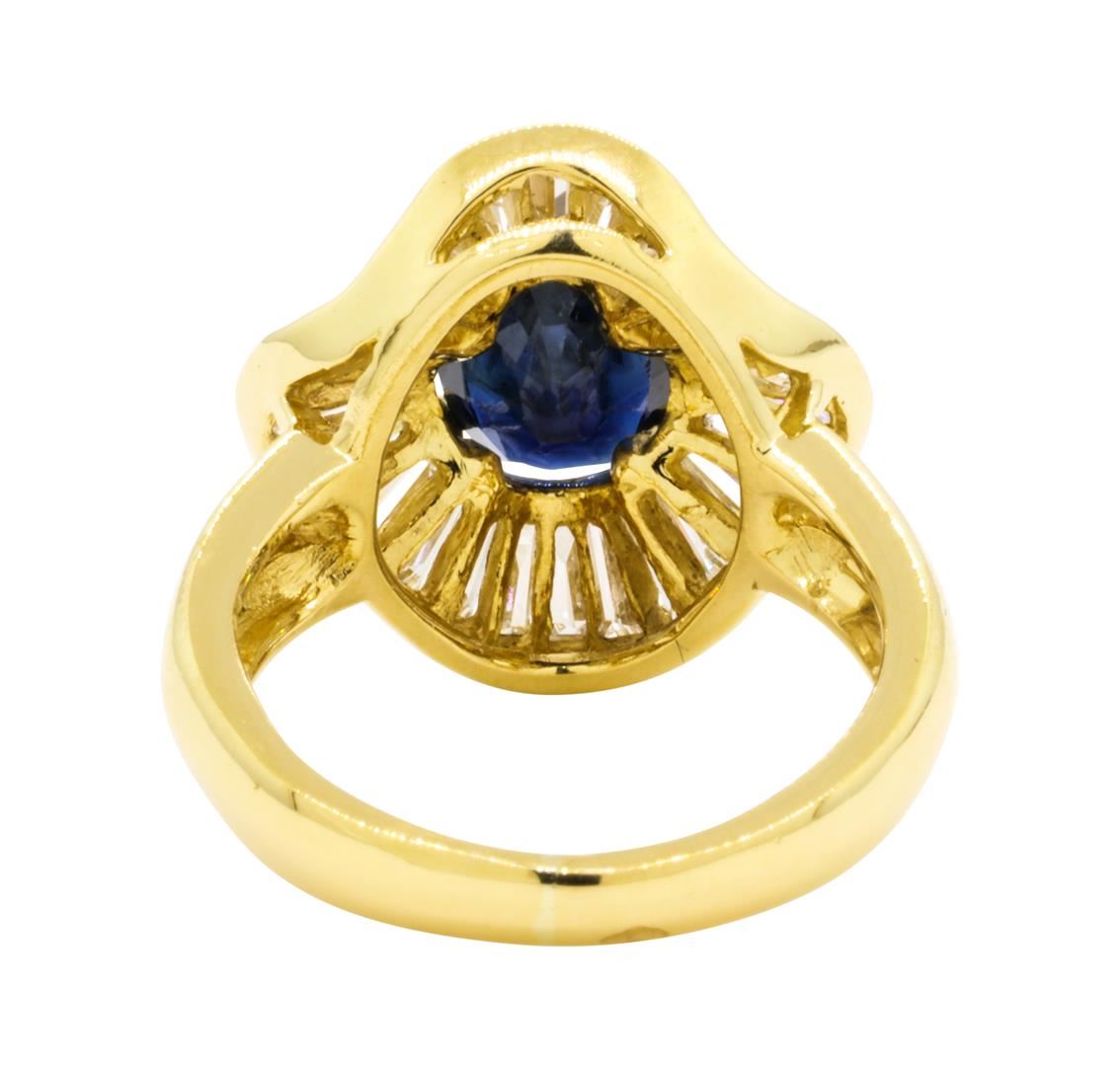 One electronically tested 18KT yellow gold lady's cast fashion ballerina ring with a split shank with a bright polish finish. The featured lady's ring has a shank measuring 2.30 millimeters wide. Identified with markings of '18K'. Condition is like new, g
