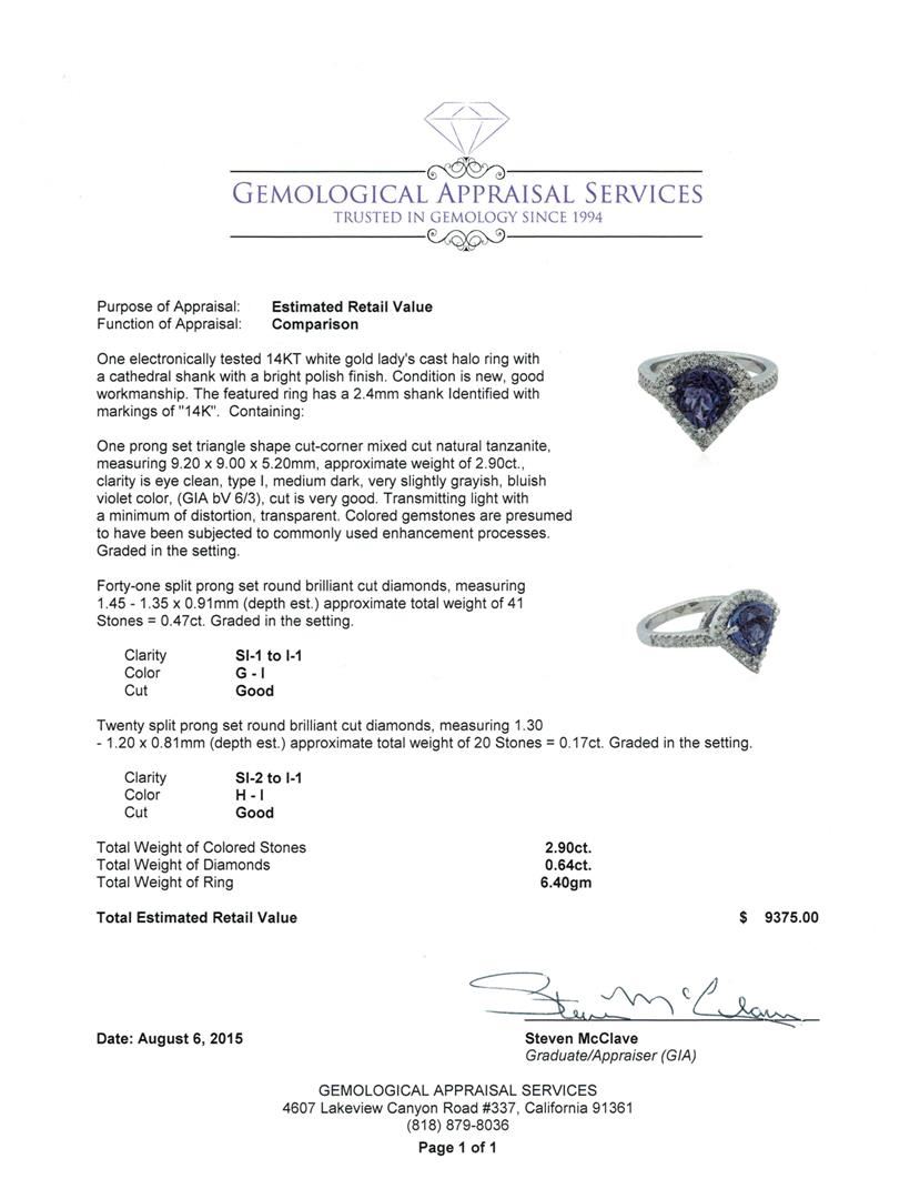 One electronically tested 14KT white gold lady's cast halo ring with a cathedral shank with a bright polish finish. The featured ring has a 2.4mm shank Identified with markings of "14K". Condition is new, good workmanship. Containing: One prong set triangle shape cut-corner mixed cut natural tanzanite, measuring 9.20 x 9.00 x 5.20mm, approximate weight of 2.90ct., clarity is eye clean, type I, medium dark, very slightly grayish, bluish violet color, (GIA bV 6/3), cut is very good. Transmitting light with a minimum of distortion, transparent. Colored gemstones are presumed to have been subjected to commonly used enhancement processes. Graded in the setting. Forty-One split prong set round brilliant cut diamonds, measuring 1.45 - 1.35 x 0.91mm (depth est.) approximate. Total Weight of 41 Stones = 0.47ct. Graded in the setting. Clarity: SI-1 to I-1. Color: G - I. Cut Good Twenty split prong set round brilliant cut diamonds, measuring 1.30 - 1.20 x 0.81mm (depth est.) approximate. Total Weight of 20 Stones = 0.17ct. Graded in the setting. Clarity: SI-2 to I-1. Color: H - I. Cut Good. Total Weight of Colored Stones 2.90ct. Total Weight of Diamonds 0.64ct. Total Weight of Ring 6.40gm. GAS Appraised at $9,375.00.