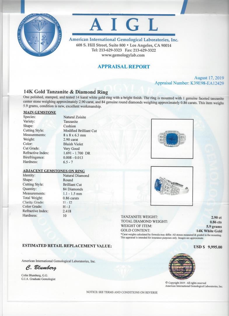 One 2.90 ct Tanzanite and Diamond Ring - 14KT White Gold. AIG certified. See Appraisal for more details. AIG Appraised.