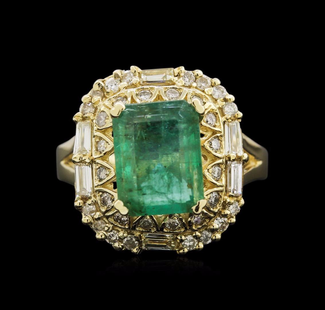 One electronically tested 14KT yellow gold lady's cast fashion ring with a basket halo with a bright polish finish. The featured lady's ring has a shank measuring 2.73 millimeters wide, Identified with markings of "14K". Condition is new, good workmanship. Containing: One prong set emerald step cut natural emerald, measuring 10.48 x 8.05 x 4.18mm, 10% bulge factor, approximate weight of 2.90ct., clarity is moderately included, type III, medium, very slightly grayish, very slightly bluish green color, (GIA vslbG 5/3), cut is good. Transmitting light somewhat diffusely, semi-transparent to translucent. Naturally occurring internal & external characteristics are present. Indications of oil residue. Graded in the setting. Six prong set baguette cut diamonds, measuring 3.40 x 1.90 x 1.62mm (depth est.) approximate total weight of 6 Stones = 0.35ct. Graded in the setting. Clarity: VS-1 to VS-2. Color: H - I. Cut Good Thirty-Two prong set round brilliant cut diamonds, measuring 1.70 - 1.60 x 1.04mm (depth est.) approximate total weight of 32 Stones = 0.55ct. Graded in the setting. Clarity: SI-1 to I-1. Color: H - I. Cut Good. Total Weight of Colored Stones 2.90ct. Total Weight of Diamonds 0.90ct. Total Weight of Ring 8.90gm. GAS Appraised at $5,600.00.