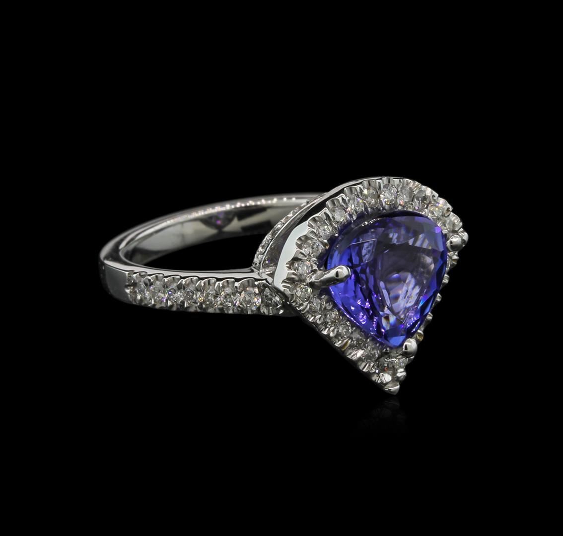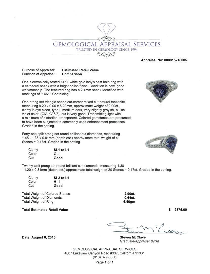 One electronically tested 14KT white gold lady's cast halo ring with a cathedral shank with a bright polish finish. The featured ring has a 2.4mm shank Identified with markings of "14K". Condition is new, good workmanship. Containing: One prong set triangle shape cut-corner mixed cut natural tanzanite, measuring 9.20 x 9.00 x 5.20mm, approximate weight of 2.90ct., clarity is eye clean, type I, medium dark, very slightly grayish, bluish violet color, (GIA bV 6/3), cut is very good. Transmitting light with a minimum of distortion, transparent. Colored gemstones are presumed to have been subjected to commonly used enhancement processes. Graded in the setting. Forty-One split prong set round brilliant cut diamonds, measuring 1.45 - 1.35 x 0.91mm (depth est.) approximate. Total Weight of 41 Stones = 0.47ct. Graded in the setting. Clarity: SI-1 to I-1. Color: G - I. Cut Good Twenty split prong set round brilliant cut diamonds, measuring 1.30 - 1.20 x 0.81mm (depth est.) approximate. Total Weight of 20 Stones = 0.17ct. Graded in the setting. Clarity: SI-2 to I-1. Color: H - I. Cut Good. Total Weight of Colored Stones 2.90ct. Total Weight of Diamonds 0.64ct. Total Weight of Ring 6.40gm. GAS Appraised at $9,375.00.