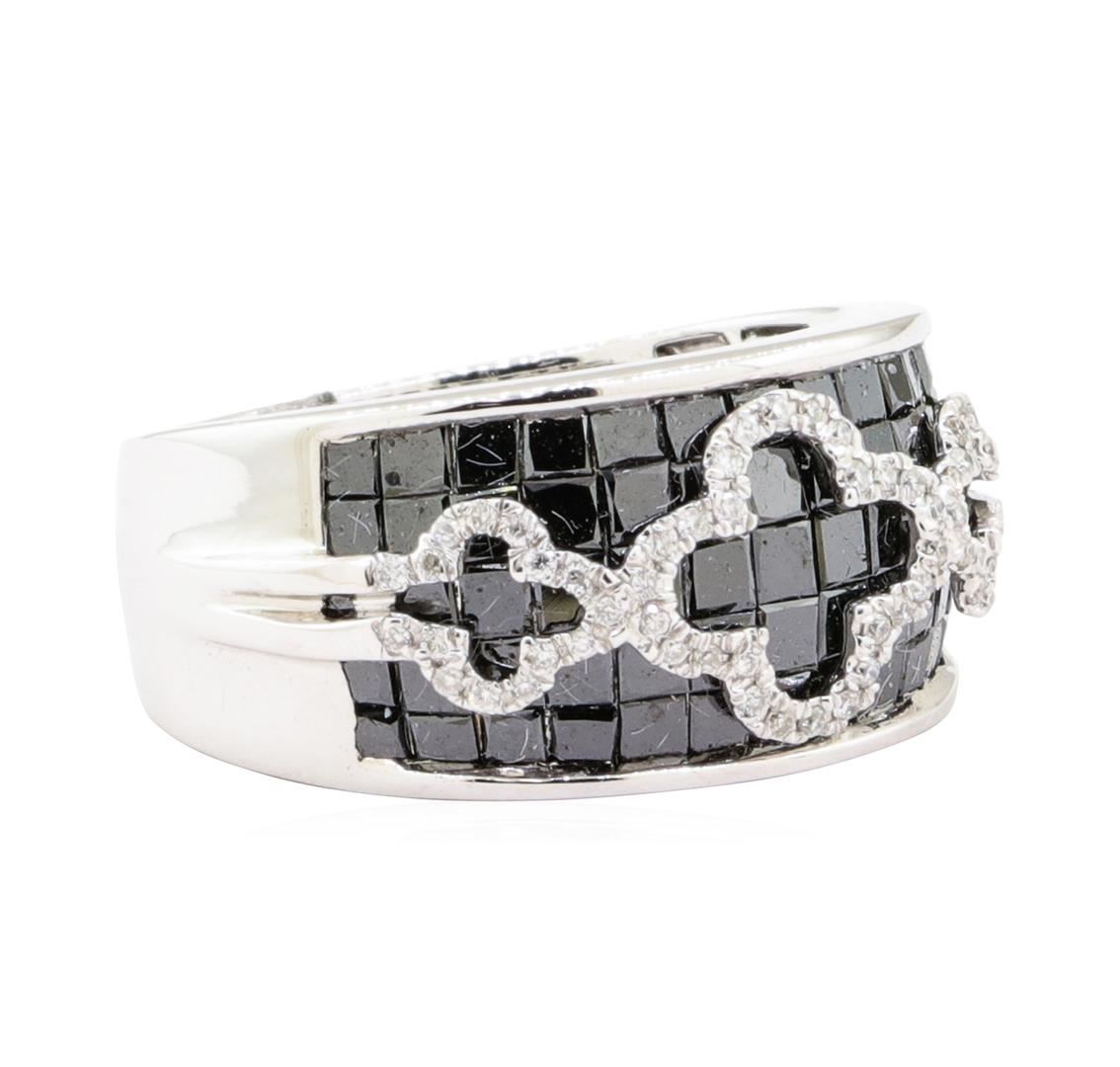 One electronically tested 14KT white gold lady's combination cast & assembled fashion ring with a five row wide band tapered shank with a bright polish finish. The featured lady's ring has a shank measuring 5.00 millimeters wide. Identified with markings of '14K'. Condition is new, good workmanship. Containing: Sixty-Five invisible set princess cut treated diamonds, measuring 2.10 x 1.80 x 1.35mm (depth est.) approximate total weight of 65 Stones = 2.69ct. Colored gemstones are presumed to have been subjected to commonly used enhancement processes. Graded in the setting. Color Fancy Black Cut Good Fifty-Six prong set round brilliant cut diamonds, measuring 1.10 - 1.00 x 0.63mm (depth est.) approximate total weight of 56 Stones = 0.22ct. Graded in the setting. Color H - I Clarity SI-1 to SI-2 Cut Good. Total Weight of Diamonds 2.91ct.. Total Weight of Ring 8.00gm GAS Appraised at $5260.00. GAS Appraised.