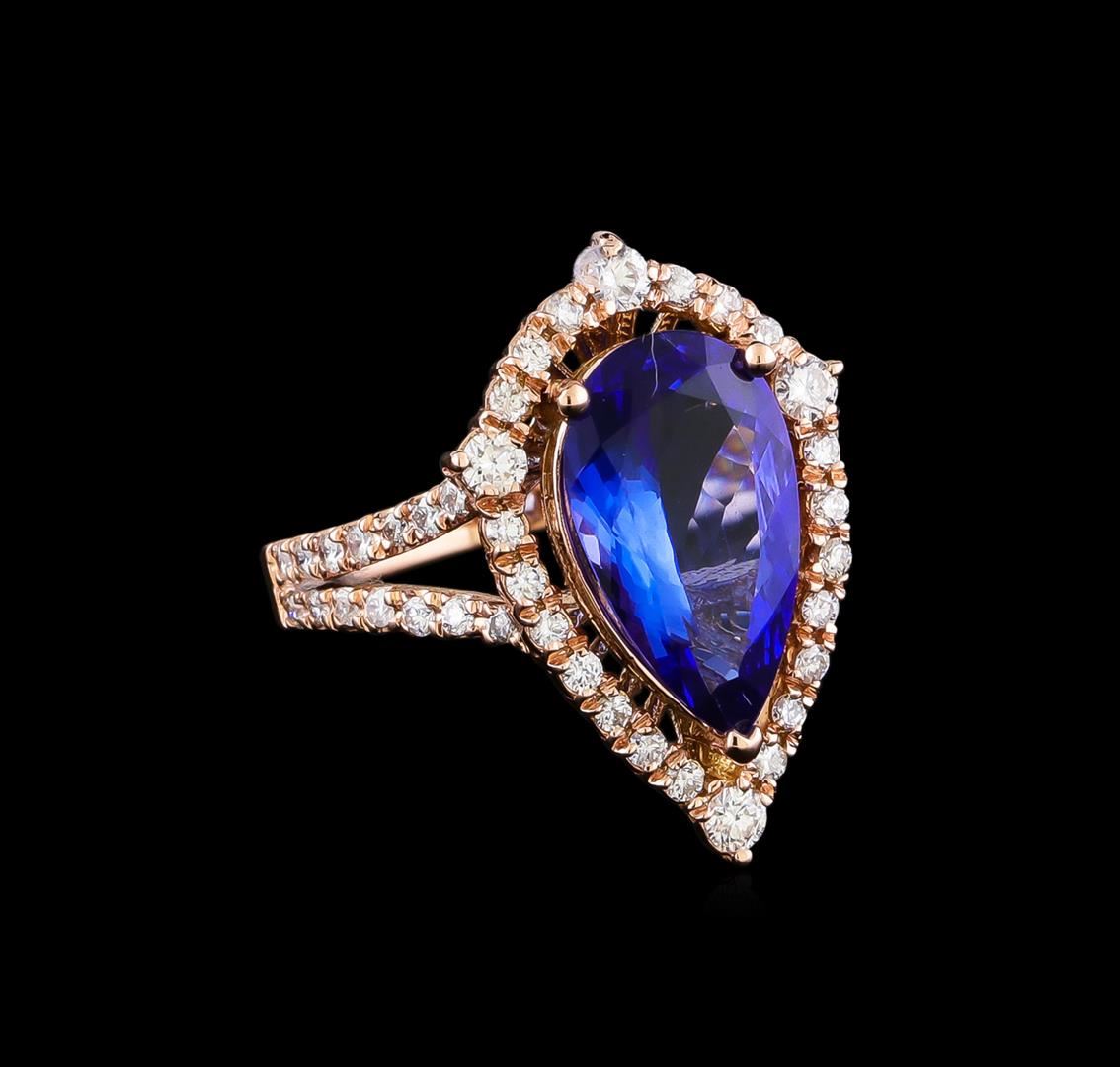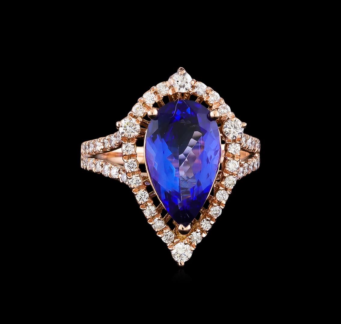 One electronically tested 14KT rose gold lady's cast fashion ring with a split shank basket halo with a bright polish finish. The featured lady's ring has a shank measuring 1.96 millimeters in width. Identified with markings of "K14". Condition is new, good workmanship. Containing: One prong set pear modified brilliant cut natural tanzanite, measuring 13.80 x 7.91 x 4.10mm, (depth est.) approximate weight of 2.91ct., clarity is eye clean, medium dark, moderately strong, bluish violet color, (GIA bV 6/4), cut is very good. Transmitting light with no distortion, transparent. Colored gemstones are presumed to have been subjected to commonly used enhancement processes. Graded in the setting. Four prong set round brilliant cut diamonds, measuring 2.20 - 2.10 x 1.31mm (depth est.) approximate total weight of 4 Stones = 0.16ct. Graded in the setting. Clarity: SI-1 to SI-2. Color: H - I. Cut Good Forty-Eight prong set round brilliant cut diamonds, measuring 1.40 - 1.30 x 0.81mm (depth est.) approximate total weight of 48 Stones = 0.46ct. Graded in the setting. Clarity: SI-1 to SI-2. Color: H - I. Cut Good. Total Weight of Colored Stones 2.91ct. Total Weight of Diamonds 0.62ct. Total Weight of Ring 4.80gm GAS Appraised at $6,865.00.