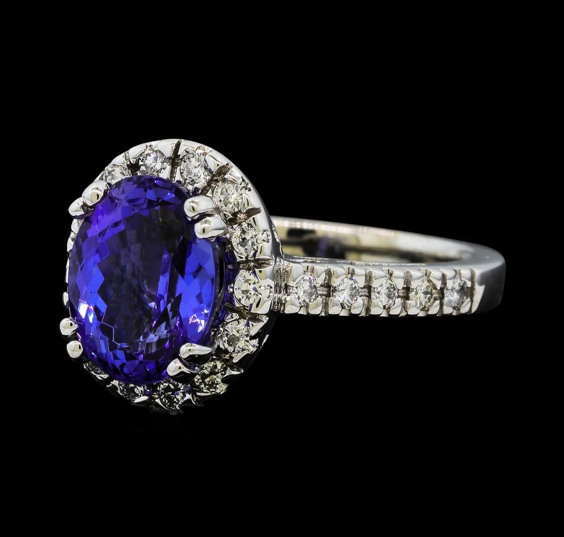 One electronically tested 14KT white gold lady's cast fashion ring with a cathedral shank with a halo with a bright polish finish. The featured lady's ring has a shank measuring 2.25 millimeters wide. Identified with markings of '14K'. Condition is new, good workmanship. Containing: One prong set oval modified brilliant cut natural tanzanite, measuring 9.56 x 7.50 x 5.28mm, (depth est.) 10%. bulge factor, approximate weight of 2.91ct., clarity is eye clean, medium dark, strong, violetish blue color, (GIA vB 6/5), cut is very good. Transmitting light with no distortion, transparent. Colored gemstones are presumed to have been subjected to commonly used enhancement processes. Graded in the setting. Twenty-Four prong set round brilliant cut diamonds, measuring 1.70 - 1.65 x 1.04mm (depth est.) approximate total weight of 24 Stones = 0.43ct. Graded in the setting. Clarity SI-1 to SI-2. Color: G - I Cut Good. Total Weight of Colored Stones 2.91ct.. Total Weight of Diamonds 0.43ct.. Total Weight of Ring 5.70gm. GAS Appraised at $6,510.00.