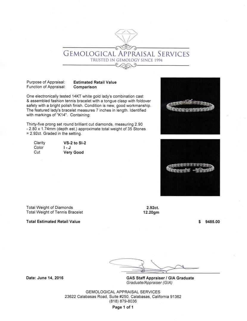 One electronically tested 14KT white gold lady's combination cast & assembled fashion tennis bracelet with a tongue clasp with foldover safety with a bright polish finish. The featured lady's bracelet measures 7 inches in length. Identified with markings of "K14". Condition is new, good workmanship. Containing: Thirty-Five prong set round brilliant cut diamonds, measuring 2.90 - 2.80 x 1.74mm (depth est.) approximate total weight of 35 Stones = 2.92ct. Graded in the setting. Clarity: VS-2 to SI-2. Color: I - Very Good. Total Weight of Diamonds 2.92ct. Total Weight of Tennis Bracelet 12.20gm. GAS Appraised at $9,485.00.