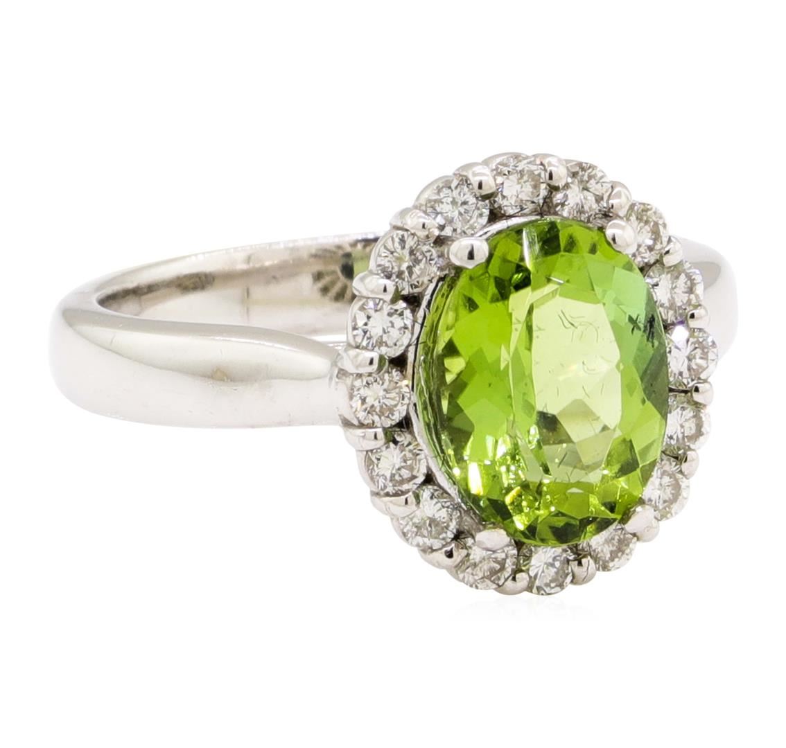 One electronically tested 14KT white gold lady's cast fashion ring with a basket halo with a bright polish finish. The featured lady's ring has a shank measuring 3.10 millimeters wide. Identified with markings of '14K'. Condition is new, good workmanship. Containing: One prong set oval modified mixed cut natural green tourmaline, measuring 10.08 x 7.65 x 4.90mm, (depth est.) approximate weight of 2.43ct., clarity is eye clean, medium, moderately strong, yellowish green color, (GIA yG 5/4), cut is very good. Transmitting light with no distortion, transparent. Colored gemstones are presumed to have been subjected to commonly used enhancement processes. Graded in the setting. Sixteen prong set round brilliant cut diamonds, measuring 2.00 - 1.95 x 1.23mm (depth est.) approximate total weight of 16 Stones = 0.49ct. Graded in the setting. Color H - I Clarity SI-1 to SI-2 Cut Good. Total Weight of Colored Stones 2.43ct.. Total Weight of Diamonds 0.49ct.. Total Weight of Ring 5.40gm GAS Appraised at $3780.00. GAS Appraised.