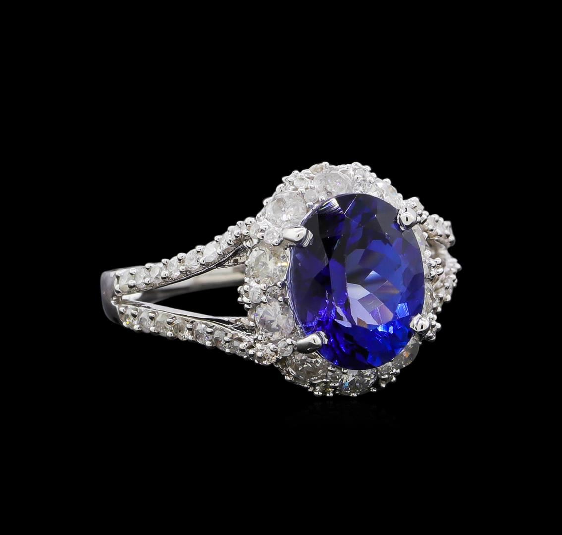 One electronically tested 14KT white gold ladies cast tanzanite and diamond ring with a bright polish finish. The featured tanzanite is set within a stylized diamond bezel supported by diamond set split shoulders, completed by a one and one-half millimeter wide band. Trademark is Orianne. Identified with markings of "14K". Condition is new, good workmanship. Containing: One prong set oval mixed cut natural tanzanite, measuring 9.90 x 7.75 x 5.40mm, approximate weight of 2.92ct., clarity is eye clean, type I, dark, very slightly grayish, blue color, (GIA B 7/3), cut is good. Natural Tanzanite, color enhanced due to cobalt coating. The presence of the coating prevents determining the stone's actual depth of color. Transmitting light with no distortion, transparent. Grading in the setting. The cobalt coated Tanzanite has a low tolerance to ultrasonic cleaning, and should not be cleaned using this method. Tanzanite is a very rare gemstone that is only found in the country of Tanzania. Originally discovered in 1967. Tiffany & Company, named the stone Tanzanite. It is found in the Usumburu Mountains that border the Umba Valley of northern Tanzania. Tanzanite occurs in gray, brown, violet, blue, reddish-purple, & green. The gem is interesting because of its exceptional pleochroism. Rotated in different directions a tanzanite will exhibit multiple changes of color. One Hundred Forty prong set round brilliant cut diamonds approximate total weight of 140 Stones = 1.09ct. Graded in the setting. Clarity: I-2 to I-3. Color: H - J. Total Weight of Colored Stones 2.92ct. Total Weight of Diamonds 1.09ct. Total Weight of Ring 4.54gm. AIG Appraised at $4,690.00.