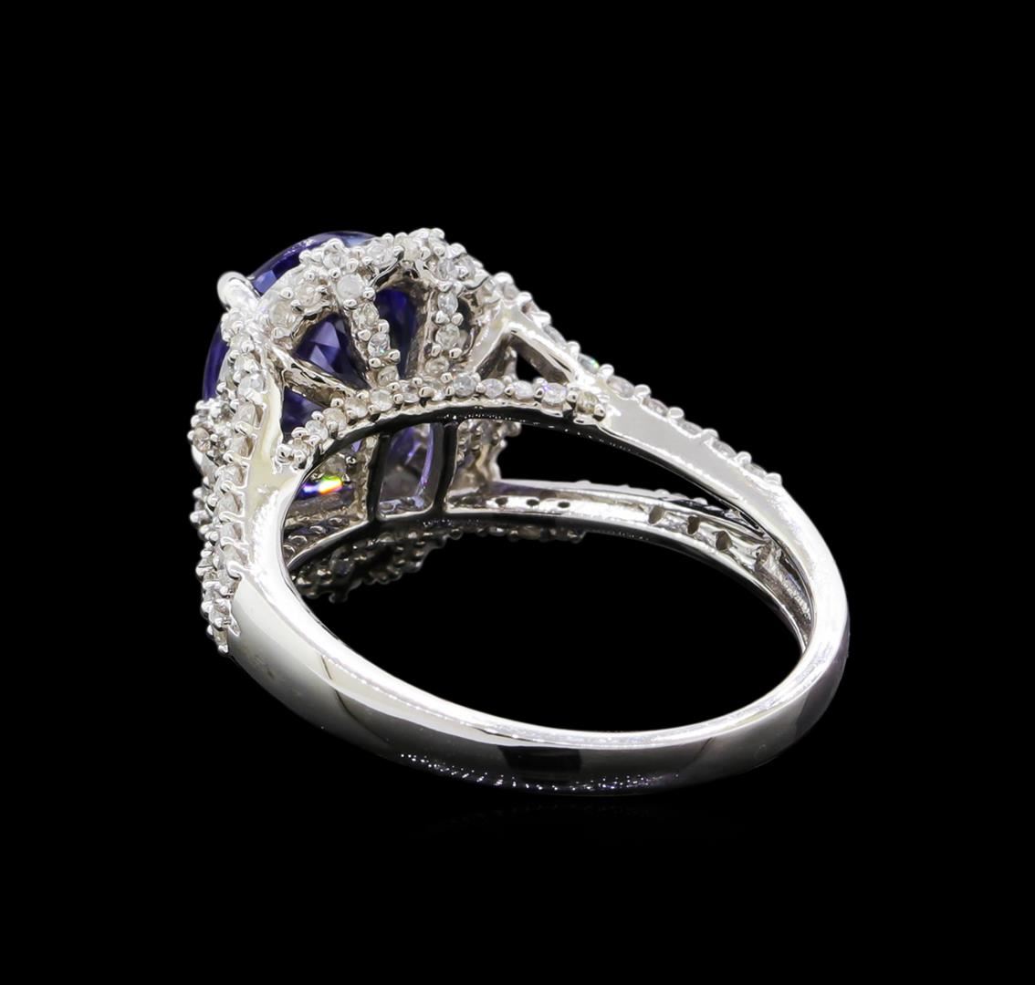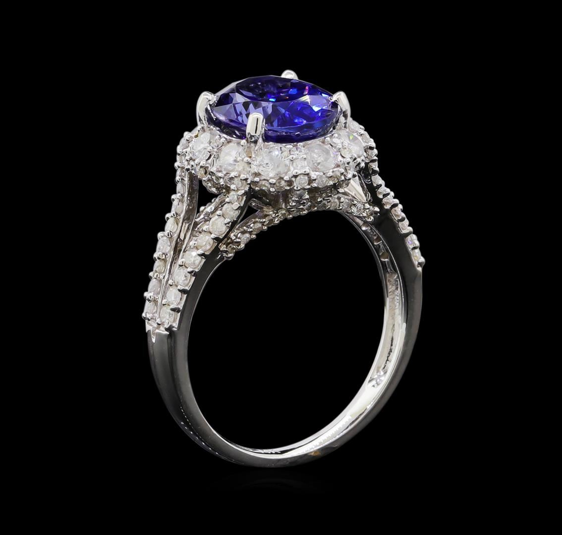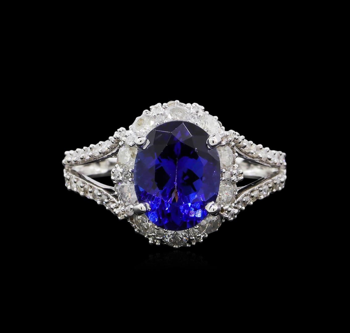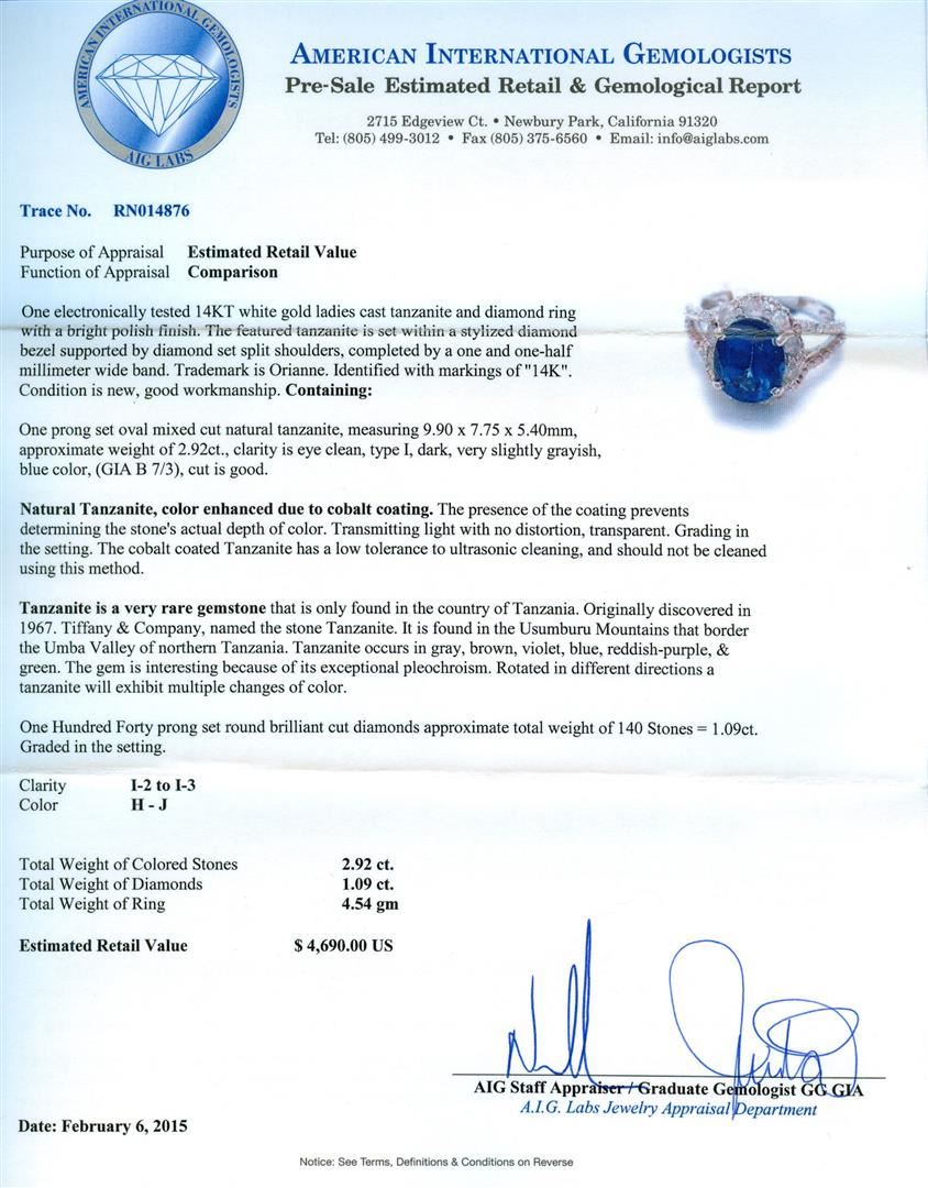 One electronically tested 14KT white gold ladies cast tanzanite and diamond ring with a bright polish finish. The featured tanzanite is set within a stylized diamond bezel supported by diamond set split shoulders, completed by a one and one-half millimeter wide band. Trademark is Orianne. Identified with markings of "14K". Condition is new, good workmanship. Containing: One prong set oval mixed cut natural tanzanite, measuring 9.90 x 7.75 x 5.40mm, approximate weight of 2.92ct., clarity is eye clean, type I, dark, very slightly grayish, blue color, (GIA B 7/3), cut is good. Natural Tanzanite, color enhanced due to cobalt coating. The presence of the coating prevents determining the stone's actual depth of color. Transmitting light with no distortion, transparent. Grading in the setting. The cobalt coated Tanzanite has a low tolerance to ultrasonic cleaning, and should not be cleaned using this method. Tanzanite is a very rare gemstone that is only found in the country of Tanzania. Originally discovered in 1967. Tiffany & Company, named the stone Tanzanite. It is found in the Usumburu Mountains that border the Umba Valley of northern Tanzania. Tanzanite occurs in gray, brown, violet, blue, reddish-purple, & green. The gem is interesting because of its exceptional pleochroism. Rotated in different directions a tanzanite will exhibit multiple changes of color. One Hundred Forty prong set round brilliant cut diamonds approximate total weight of 140 Stones = 1.09ct. Graded in the setting. Clarity: I-2 to I-3. Color: H - J. Total Weight of Colored Stones 2.92ct. Total Weight of Diamonds 1.09ct. Total Weight of Ring 4.54gm. AIG Appraised at $4,690.00.