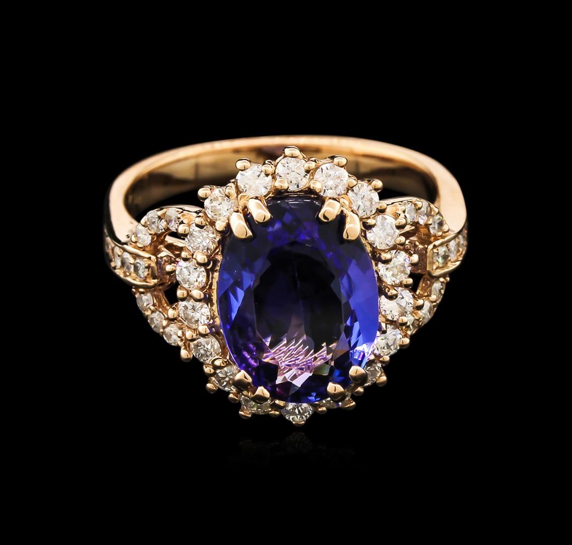 One electronically tested 14KT rose gold lady's cast fashion ring with a basket halo with a bright polish finish. The featured lady's ring has a 2.45 millimeter wide shank. Identified with markings of "K14". Condition is new, good workmanship. Containing: One prong set oval modified brilliant cut natural tanzanite, measuring 11.39 x 8.58 x 4.03mm, 5% bulge factor, approximate weight of 2.92ct., clarity is eye clean, type I, medium light, very slightly grayish, bluish violet color, (GIA bV 4/3), cut is good. Transmitting light with no distortion, transparent. Colored gemstones are presumed to have been subjected to commonly used enhancement processes. Graded in the setting. Eighteen prong set round brilliant cut diamonds, measuring 1.80 - 1.75 x 1.16mm (depth est.) approximate total weight of 18 Stones = 0.40ct. Graded in the setting. Clarity: SI-2 to I-1. Color: H - I. Cut Good Twenty-Eight prong set round brilliant cut diamonds, measuring 1.40 - 1.35 x 0.90mm (depth est.) approximate total weight of 28 Stones = 0.30ct. Graded in the setting. Clarity: SI-2 to I-1. Color: H - I. Cut Good. Total Weight of Colored Stones 2.92ct. Total Weight of Diamonds 0.70ct. Total Weight of Ring 4.40gm. GAS Appraised at $5,945.00.