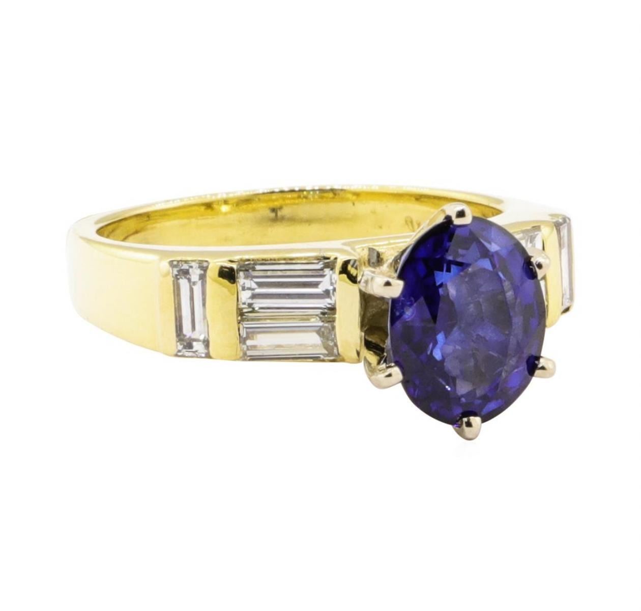 One electronically tested 18KT yellow gold lady's combination cast & assembled fashion ring with elevated shoulders with a tapered shank with a bright polish finish. The featured lady's ring has a shank measuring 2.65 millimeters wide. Identified with markings of '18K'. Condition is like new, good workmanship. Containing: One prong set oval modified mixed cut natural blue sapphire, measuring 8.70 x 6.95 x 4.40mm, (depth est.) approximate weight of 2.20 ct., clarity is slightly included, medium dark, moderately strong, blue color, (GIA B 6/4), cut is good. Transmitting light with a minimum of distortion, transparent. Colored gemstones are presumed to have been subjected to commonly used enhancement processes. Graded in the setting. Four channel set baguette cut diamonds, measuring from 4.25 x 2.00 x 1.70mm (depth est.) to 4.30 x 2.00 x 1.70mm (depth est.) approximate total weight of 4 Stones = 0.55ct. Graded in the setting. Color H - I Clarity VS-1 to VS-2 Cut Very Good Two channel set baguette cut diamonds, measuring from 3.95 x 1.65 x 1.40mm (depth est.) to 4.00 x 1.70 x 1.45mm (depth est.) approximate total weight of 2 Stones = 0.18ct. Graded in the setting. Color H - I Clarity VS-1 to VS-2 Cut Very Good. Total Weight of Colored Stones 2.20 ct.. Total Weight of Diamonds 0.73ct.. Total Weight of With Elevated Shoulders 6.10gm GAS Appraised at $4630.00. GAS Appraised.