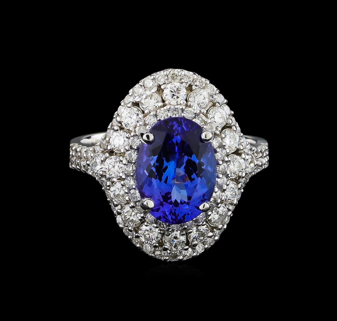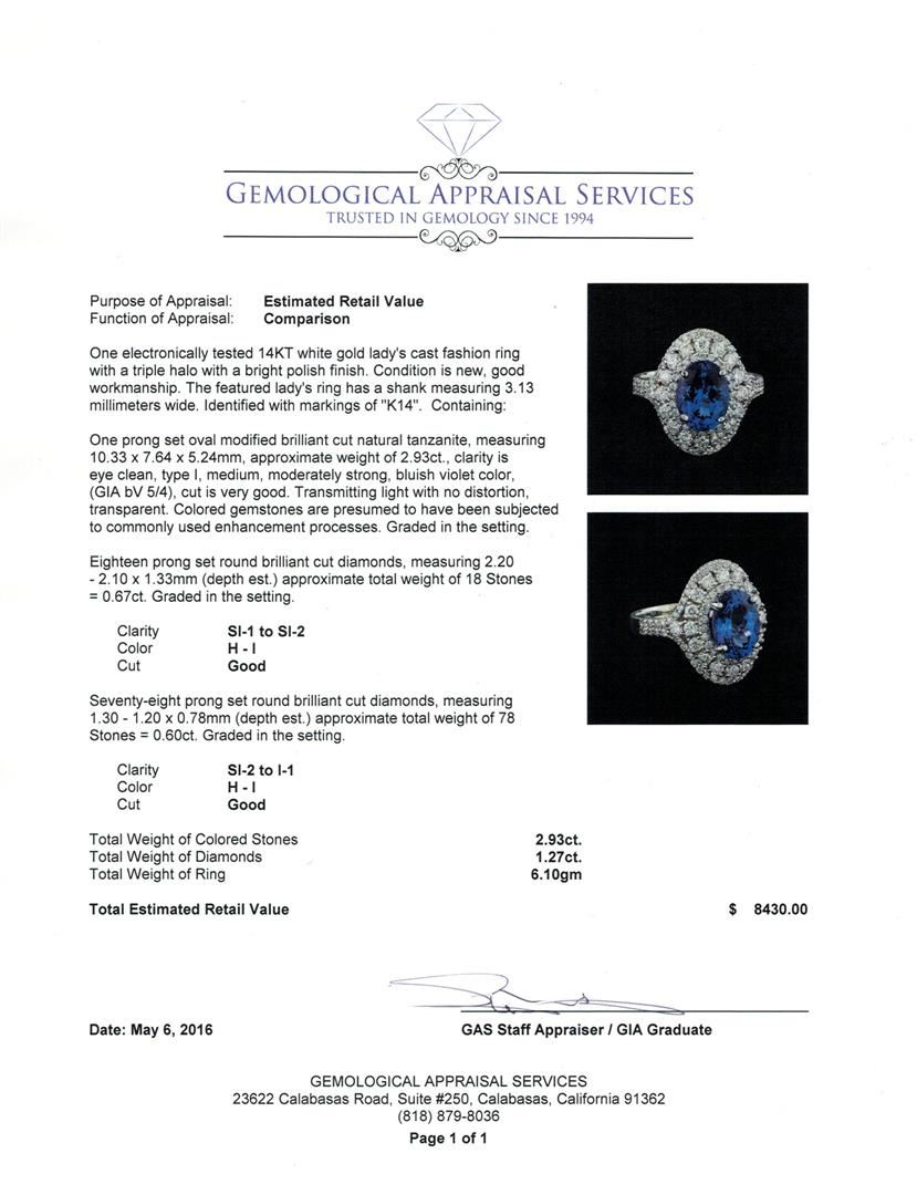 One electronically tested 14KT white gold lady's cast fashion ring with a triple halo with a bright polish finish. The featured lady's ring has a shank measuring 3.13 millimeters wide. Identified with markings of "K14". Condition is new, good workmanship. Containing: One prong set oval modified brilliant cut natural tanzanite, measuring 10.33 x 7.64 x 5.24mm, approximate weight of 2.93ct., clarity is eye clean, type I, medium, moderately strong, bluish violet color, (GIA bV 5/4), cut is very good. Transmitting light with no distortion, transparent. Colored gemstones are presumed to have been subjected to commonly used enhancement processes. Graded in the setting. Eighteen prong set round brilliant cut diamonds, measuring 2.20 - 2.10 x 1.33mm (depth est.) approximate total weight of 18 Stones = 0.67ct. Graded in the setting. Clarity: SI-1 to SI-2. Color: H - I. Cut Good Seventy-Eight prong set round brilliant cut diamonds, measuring 1.30 - 1.20 x 0.78mm (depth est.) approximate total weight of 78 Stones = 0.60ct. Graded in the setting. Clarity: SI-2 to I-1. Color: H - I. Cut Good. Total Weight of Colored Stones 2.93ct. Total Weight of Diamonds 1.27ct. Total Weight of Ring 6.10gm GAS Appraised at $8,430.00.