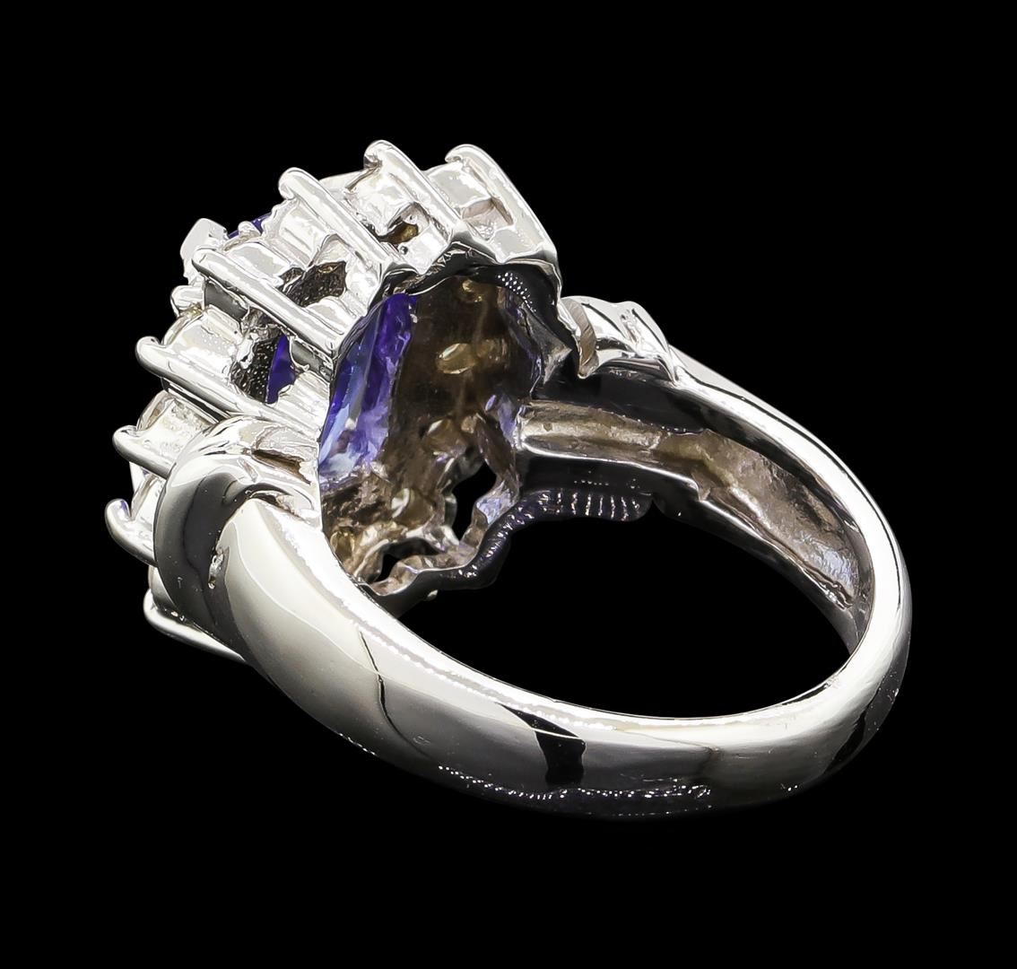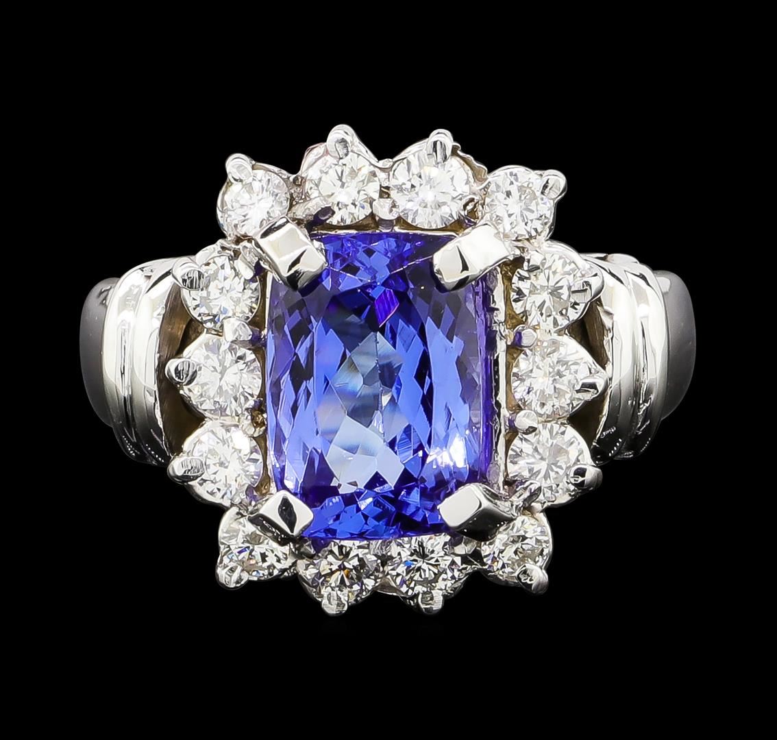 One electronically tested 14KT white gold lady's cast fashion ring with a cathedral shank with a basket halo with a bright polish finish. The featured lady's ring has two double-wire cuffs set on the shoulders and a shank measuring 3.50 millimeters wide. Identified with markings of '14K'. Condition is new, good workmanship. Containing: One prong set rectangular cushion modified brilliant cut natural tanzanite, measuring 9.96 x 7.00 x 4.81mm, (depth est.) 10%. bulge factor, approximate weight of 2.93ct., clarity is eye clean, medium, moderately strong, violetish blue color, (GIA vB 5/4), cut is good. Transmitting light with no distortion, transparent. Colored gemstones are presumed to have been subjected to commonly used enhancement processes. Graded in the setting. Ten prong set round brilliant cut diamonds, measuring 2.70 - 2.60 x 1.64mm (depth est.) approximate total weight of 10 Stones = 0.70ct. Graded in the setting. Clarity SI-1 to I-1. Color: H - I Cut Good Four prong set round brilliant cut diamonds, measuring 2.30 - 2.20 x 1.40mm (depth est.) approximate total weight of 4 Stones = 0.18ct. Graded in the setting. Clarity SI-1 to I-1. Color: H - I Cut Good. Total Weight of Colored Stones 2.93ct.. Total Weight of Diamonds 0.88ct.. Total Weight of Ring 8.50gm. GAS Appraised at $7,225.00.
