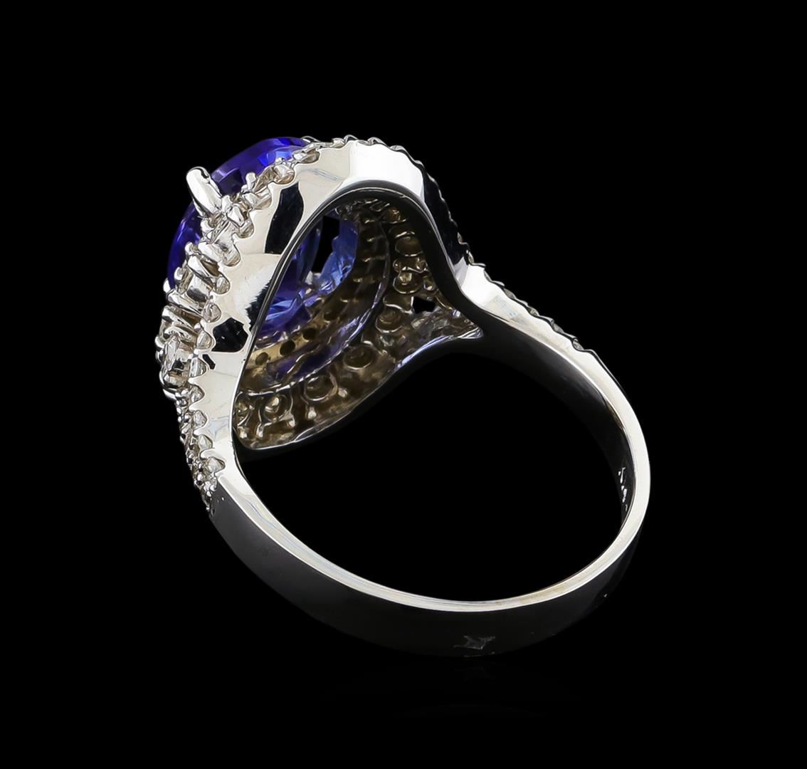 One electronically tested 14KT white gold lady's cast fashion ring with a triple halo with a bright polish finish. The featured lady's ring has a shank measuring 3.13 millimeters wide. Identified with markings of "K14". Condition is new, good workmanship. Containing: One prong set oval modified brilliant cut natural tanzanite, measuring 10.33 x 7.64 x 5.24mm, approximate weight of 2.93ct., clarity is eye clean, type I, medium, moderately strong, bluish violet color, (GIA bV 5/4), cut is very good. Transmitting light with no distortion, transparent. Colored gemstones are presumed to have been subjected to commonly used enhancement processes. Graded in the setting. Eighteen prong set round brilliant cut diamonds, measuring 2.20 - 2.10 x 1.33mm (depth est.) approximate total weight of 18 Stones = 0.67ct. Graded in the setting. Clarity: SI-1 to SI-2. Color: H - I. Cut Good Seventy-Eight prong set round brilliant cut diamonds, measuring 1.30 - 1.20 x 0.78mm (depth est.) approximate total weight of 78 Stones = 0.60ct. Graded in the setting. Clarity: SI-2 to I-1. Color: H - I. Cut Good. Total Weight of Colored Stones 2.93ct. Total Weight of Diamonds 1.27ct. Total Weight of Ring 6.10gm GAS Appraised at $8,430.00.