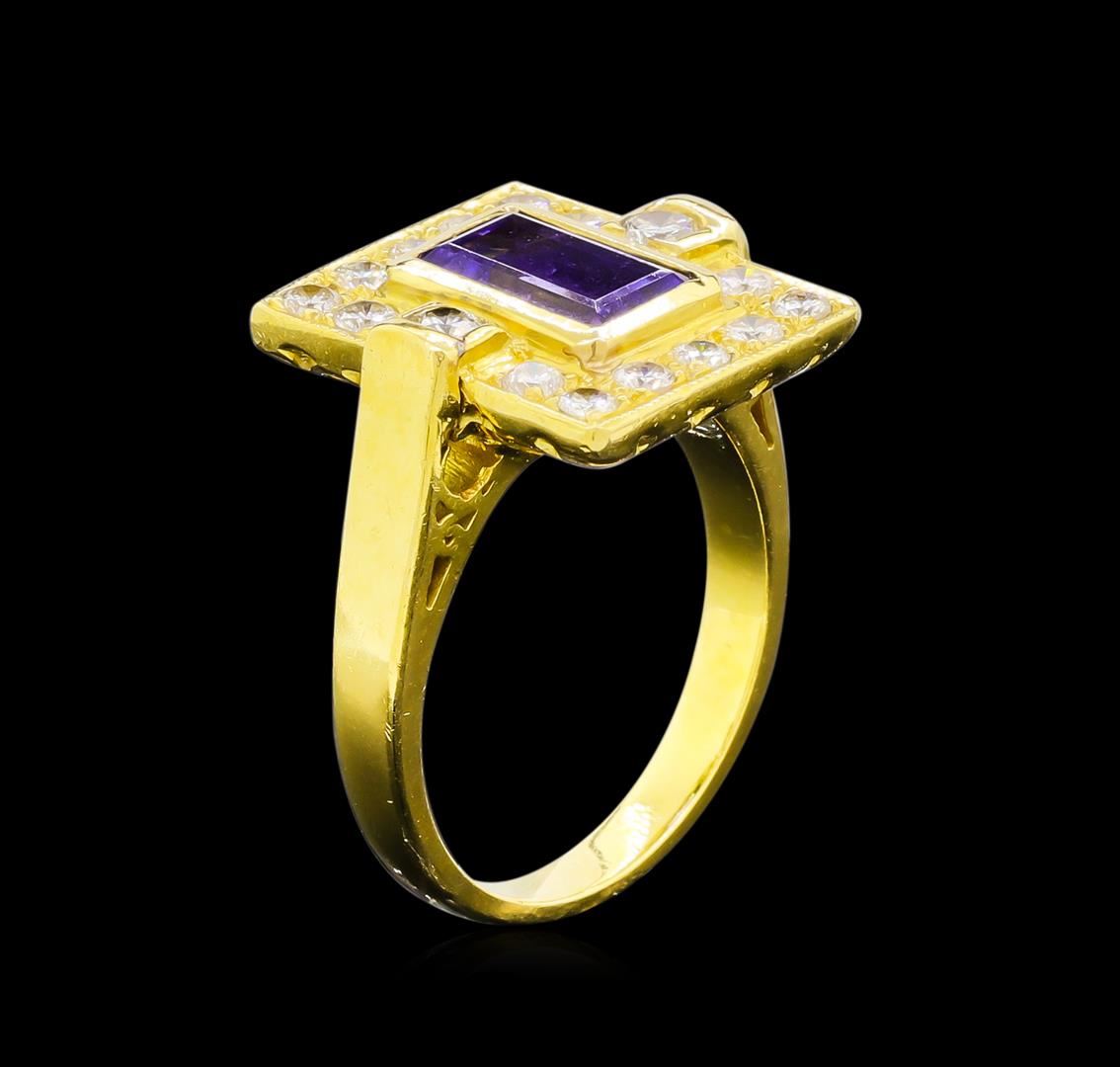 One electronically tested 18KT yellow gold lady's cast fashion ring with a halo with a bright polish finish. The featured ladies' ring has a shank measuring 2.84 millimeter in width. Identified with markings of "750". Condition is like new, good workmanship. Containing: One bezel set emerald modified step cut natural tanzanite, measuring 10.20 x 6.90 x 4.40mm, 5%. bulge factor, approximate weight of 2.94ct., clarity is eye clean, type I, medium, moderately strong, bluish violet color, (GIA bV 5/4), cut is good. Transmitting light with no distortion, transparent. Colored gemstones are presumed to have been subjected to commonly used enhancement processes. Graded in the setting. Two channel set round brilliant cut diamonds, measuring 3.00 - 2.95 x 1.88mm (depth est.) approximate total weight of 2 Stones = 0.20ct. Graded in the setting. Clarity: VS-2 to SI-1. Color: G - Good Fourteen prong set round brilliant cut diamonds, measuring 2.50 - 2.40 x 1.52mm (depth est.) approximate total weight of 14 Stones = 0.80ct. Graded in the setting. Clarity: VS-2 to SI-2. Color: G - I. Cut Good. Total Weight of Colored Stones 2.94ct. Total Weight of Diamonds 1.00ct. Total Weight of Ring 13.40gm. GAS Appraised at $9,115.00.