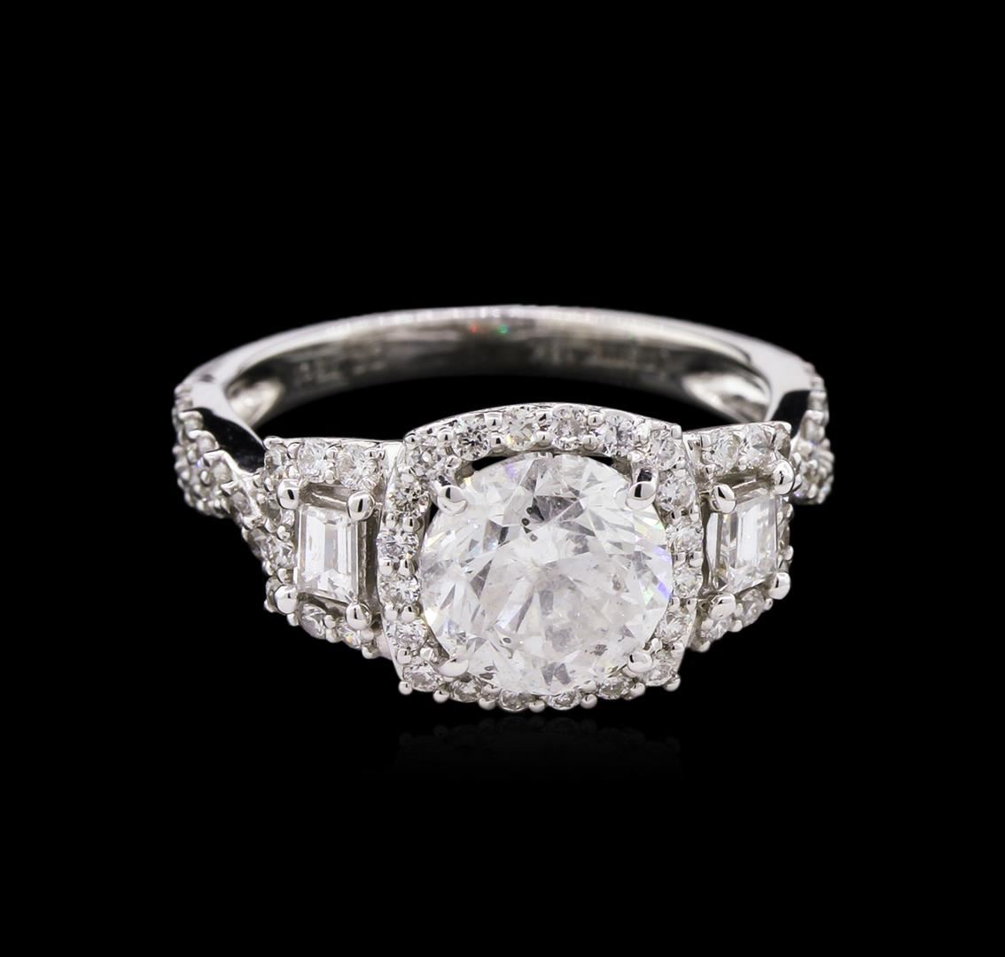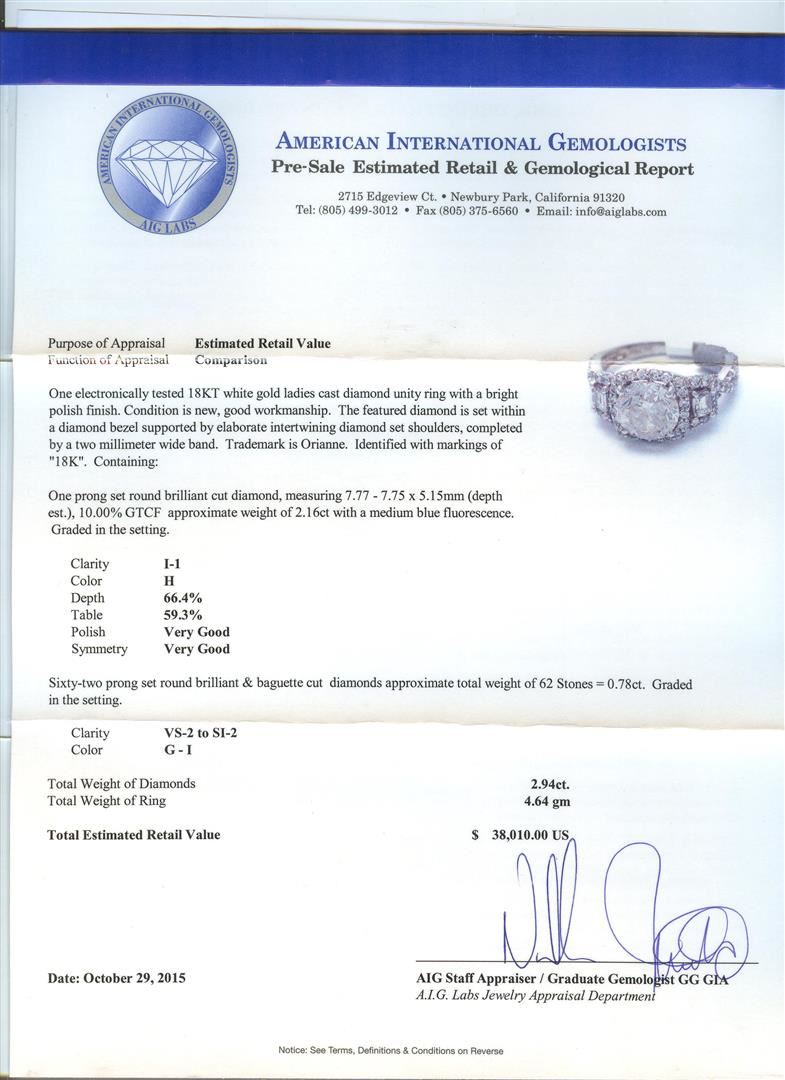 One electronically tested 18KT white gold ladies cast diamond unity ring with a bright polish finish. The featured diamond is set within a diamond bezel supported by elaborate intertwining diamond set shoulders, completed by a two millimeter wide band. Trademark is Orianne. Identified with markings of "18K". Condition is new, good workmanship. Containing: One prong set round brilliant cut diamond, measuring 7.77 - 7.75 x 5.15mm (depth est.), 10.00.%. GTCF approximate weight of 2.16ct with a medium blue fluorescence. Graded in the setting. Clarity: I-1. Color: H. Depth 66.4%. Table 59.3%. Sixty-Two prong set round brilliant & baguette cut diamonds approximate total weight of 62 Stones = 0.78ct. Graded in the setting. Clarity: VS-2 to SI-2. Color: G - I. Total Weight of Diamonds 2.94ct. Total Weight of Ring 4.64gm. AIG Appraised at $38,010.00.