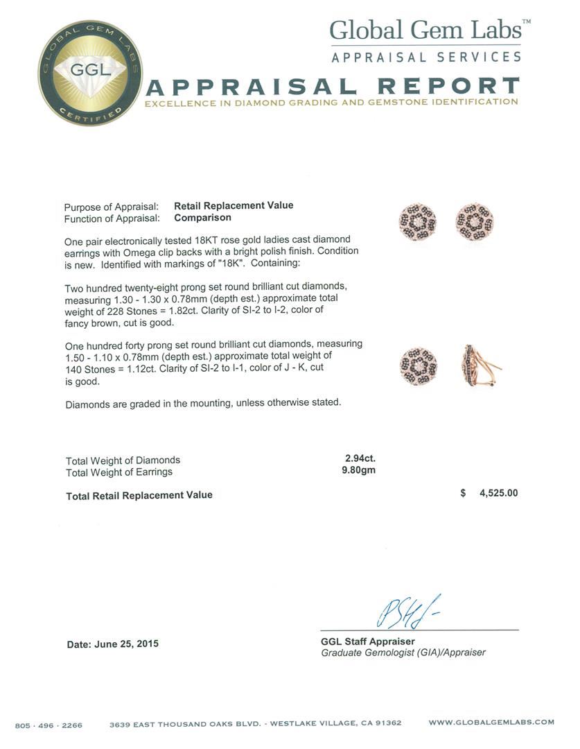 One pair electronically tested 18KT rose gold ladies cast diamond earrings with Omega clip backs with a bright polish finish. Identified with markings of "18K". Condition is new. Containing: Two Hundred Twenty-Eight prong set round brilliant cut diamonds, measuring 1.30 - 1.30 x 0.78mm (depth est.) approximate. Total Weight of 228 Stones = 1.82ct. Clarity: SI-2 to I-2, Cut is Good. One Hundred Forty prong set round brilliant cut diamonds, measuring 1.50 - 1.10 x 0.78mm (depth est.) approximate. Total Weight of 140 Stones = 1.12ct. Clarity: SI-2 to I-1. Color: J - K, Cut is Good. Diamonds are graded in the mounting, unless otherwise stated. Total Weight of Diamonds 2.94ct. Total Weight of Earrings 9.80 grams. GGL Appraised at $4,525.00.