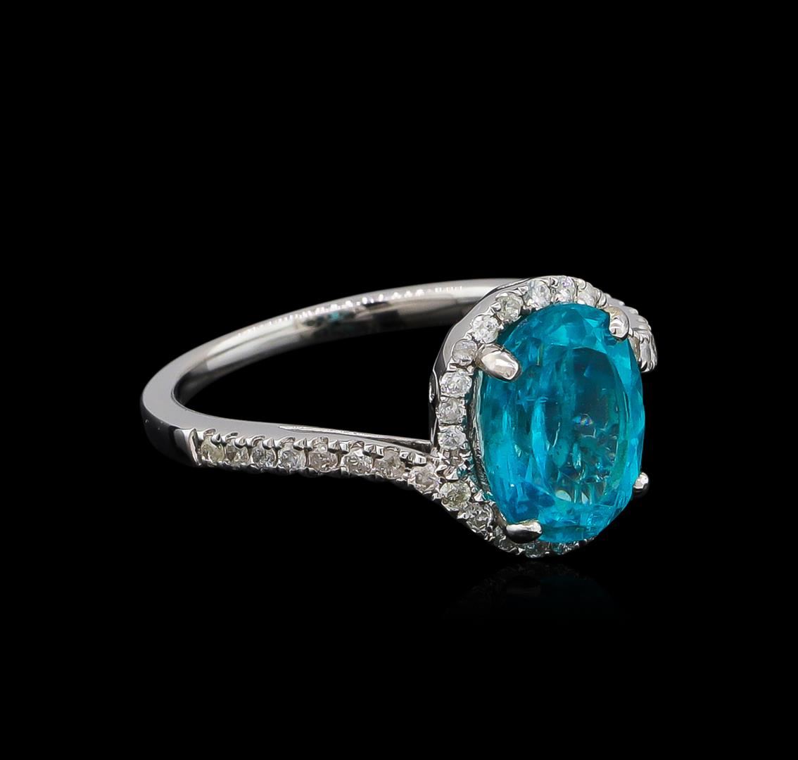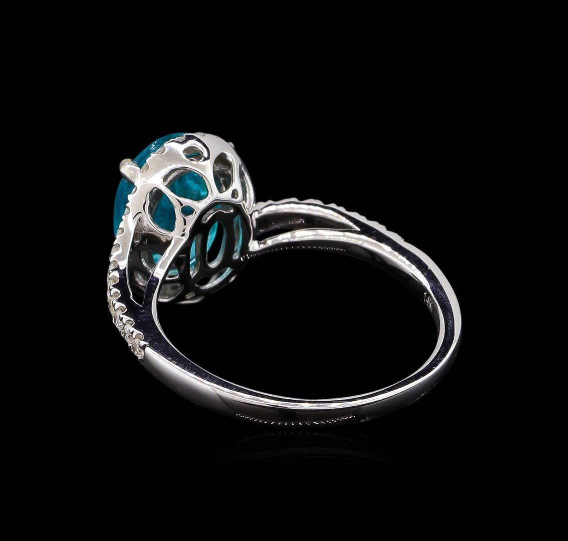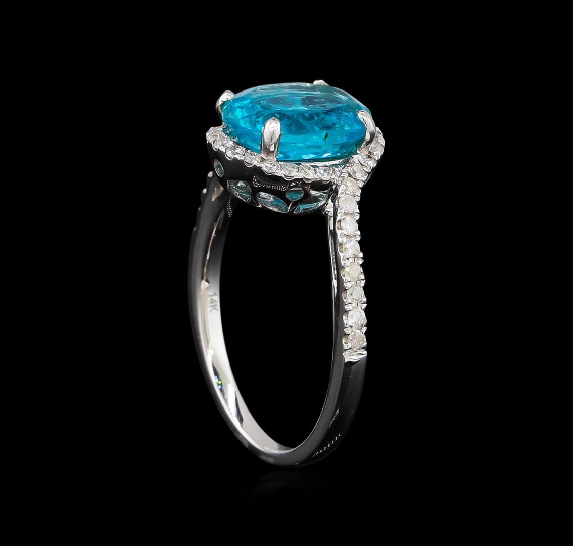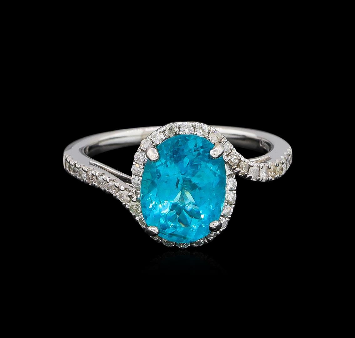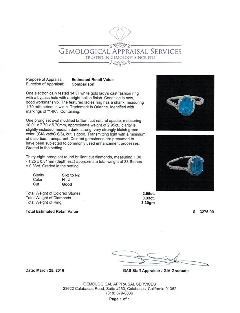 One electronically tested 14KT white gold lady's cast fashion ring with a bypass halo with a bright polish finish. The featured ladies ring has a shank measuring 1.70 millimeters in width. Trademark is Orianne. Identified with markings of "14K". Condition is new, good workmanship. Containing: One prong set oval modified brilliant cut natural apatite, measuring 10.01 x 7.70 x 5.70mm, approximate weight of 2.95ct., clarity is slightly included, medium dark, strong, very strongly bluish green color, (GIA vstbG 6/5), cut is good. Transmitting light with a minimum of distortion, transparent. Colored gemstones are presumed to have been subjected to commonly used enhancement processes. Graded in the setting. Thirty-Eight prong set round brilliant cut diamonds, measuring 1.30 - 1.25 x 0.81mm (depth est.) approximate total weight of 38 Stones = 0.33ct. Graded in the setting. Clarity: SI-2 to I-2. Color: H - J. Cut Good. Total Weight of Colored Stones 2.95ct. Total Weight of Diamonds 0.33ct. Total Weight of Ring 3.30gm. GAS Appraised at $3,275.00.