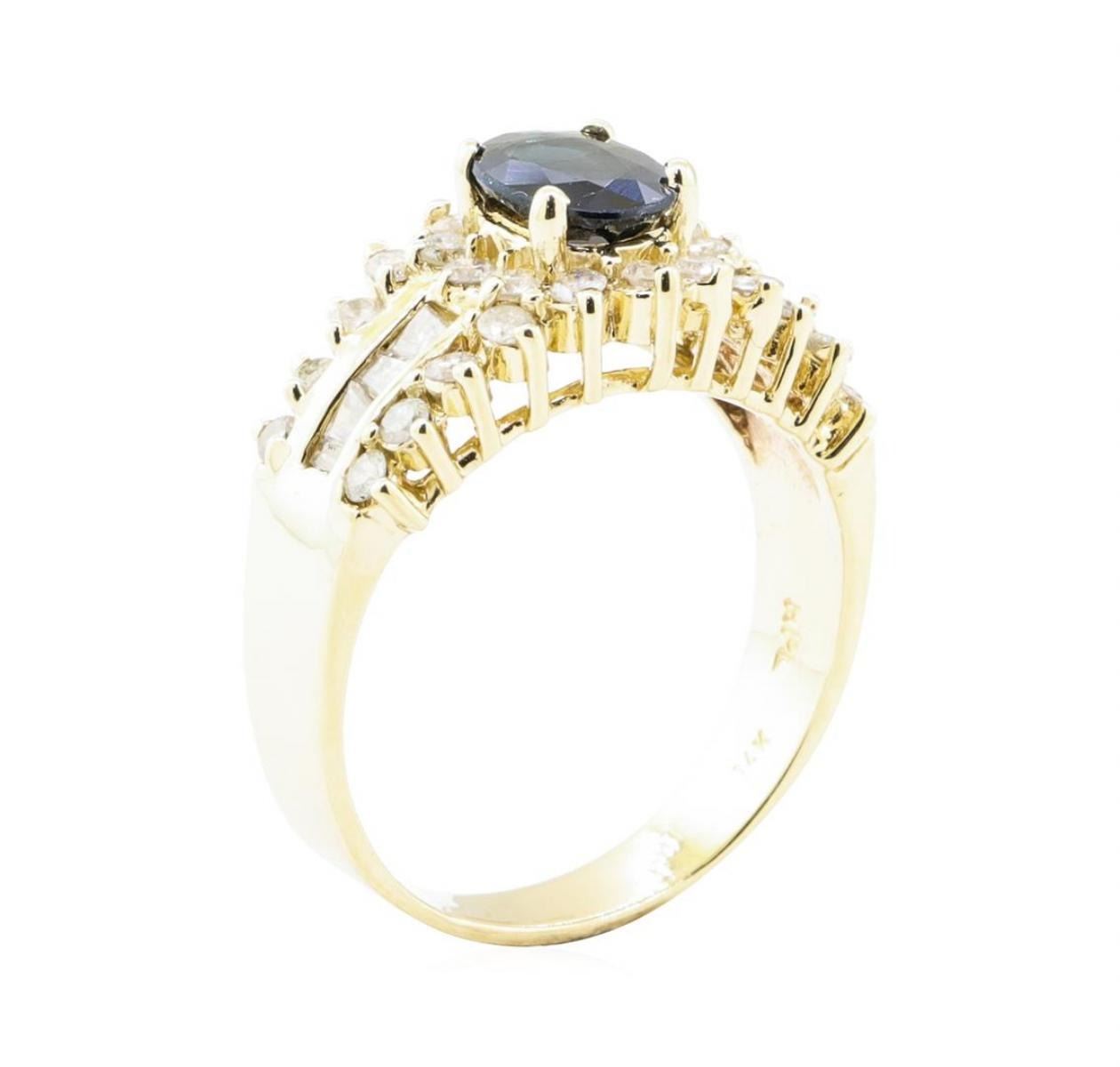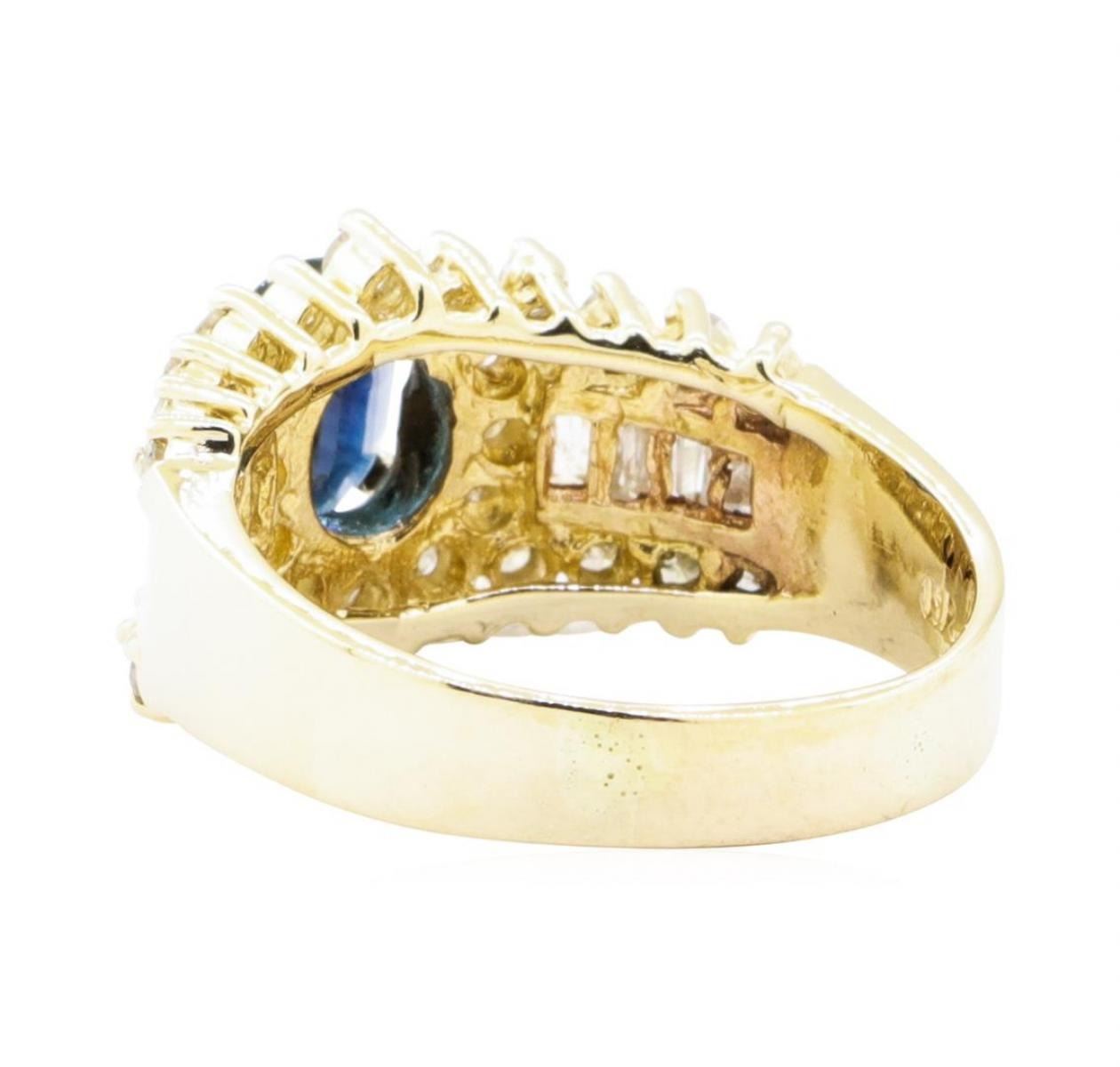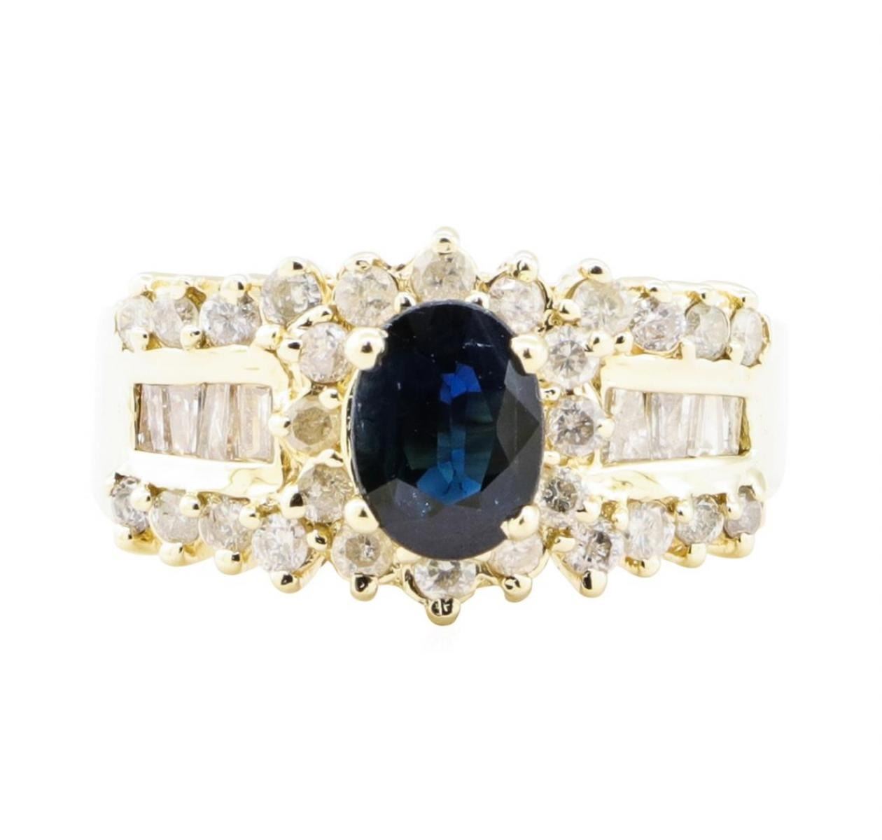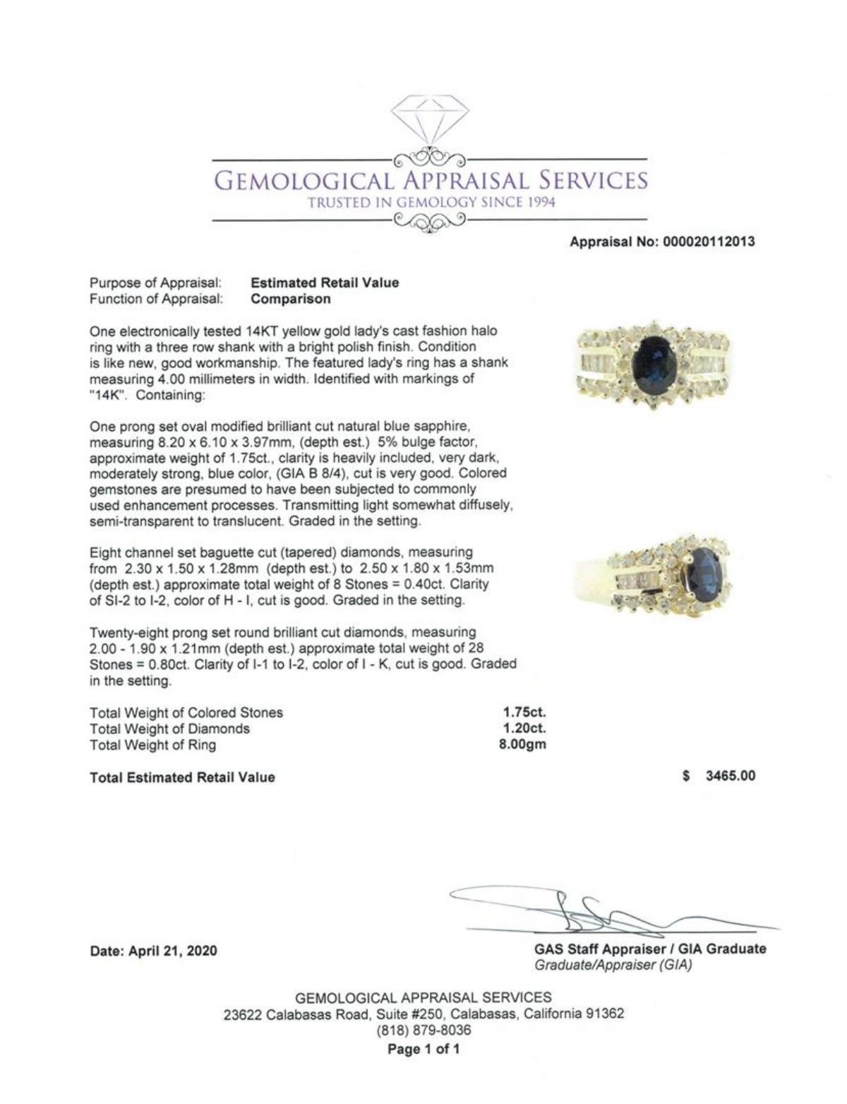One electronically tested 14KT yellow gold lady's cast fashion halo ring with a three row shank with a bright polish finish. The featured lady's ring has a shank measuring 4.00 millimeters in width. Identified with markings of '14K'. Condition is Good. Containing: One prong set oval modified brilliant cut natural blue sapphire, measuring 8.20 x 6.10 x 3.97mm, (depth est.) 5%. bulge factor, approximate weight of 1.75ct., clarity is heavily included, very dark, moderately strong, blue color, (GIA B 8/4), cut is very good. Colored gemstones are presumed to have been subjected to commonly used enhancement processes. Transmitting light somewhat diffusely, semi-transparent to translucent. Graded in the setting. Eight channel set baguette cut (tapered) diamonds, measuring from 2.30 x 1.50 x 1.28mm (depth est.) to 2.50 x 1.80 x 1.53mm (depth est.) approximate total weight of 8 Stones = 0.40 ct. Graded in the setting. Color H - I Clarity SI-2 to I-2 Cut Good Twenty-Eight prong set round brilliant cut diamonds, measuring 2.00 - 1.90 x 1.21mm (depth est.) approximate total weight of 28 Stones = 0.80 ct. Graded in the setting. Color I - K Clarity I-1 to I-2 Cut Good. Total Weight of Colored Stones 1.75ct.. Total Weight of Diamonds 1.20 ct.. Total Weight of Ring 8.00gm GAS Appraised at $3465.00. GAS Appraised.