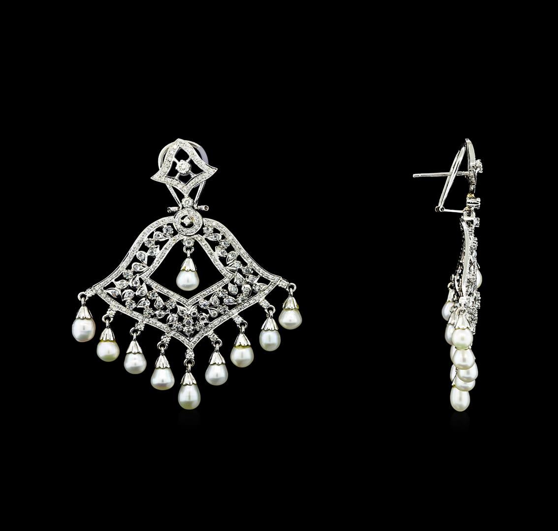 One pair electronically tested 14KT white gold lady's combination cast & assembled fashion chandelier earring with Omega clip backs with posts with a bright polish finish. The featured ladies earrings have 10 dangling round pearls with a dangle motif measuring 66 millimeters in length. Identified with markings of '14K'. Condition is new, good workmanship. Containing: Twenty Chinese freshwater pearls, 5.2mm to 5.0mm in size. The pearls are white in color with a good luster, pear, and mostly clean with very good matching. Graded in the setting. Two prong set round brilliant cut diamonds, measuring 3.00 - 2.90 x 1.80mm (depth est.) approximate total weight of 2 Stones = 0.20ct. Graded in the setting. Clarity VS-2 to SI-1. Color: H - I Cut Very Good Twenty-Two prong set round brilliant cut diamonds, measuring 2.00 - 1.60 x 1.10mm (depth est.) approximate total weight of 22 Stones = 0.45ct. Graded in the setting. Clarity VS-1 to SI-1. Color: H - I Cut Good Ninety-Four prong set rose cut diamonds, measuring 2.00 - 1.60 x 1.00mm (depth est.) approximate total weight of 94 Stones = 1.30ct. Graded in the setting. Clarity VS-2 to SI-1. Color: G - I Cut Good Two Hundred Eighty-Six pave' set round brilliant cut diamonds, measuring 1.00 - 0.95 x 0.60mm (depth est.) approximate total weight of 286 Stones = 1.00ct. Graded in the setting. Clarity VS-1 to SI-1. Color: G - H Cut Good. Total Weight of Diamonds 2.95ct.. Total Weight of Chandelier Earring 29.70gm GAS Appraised at $9,210.00.