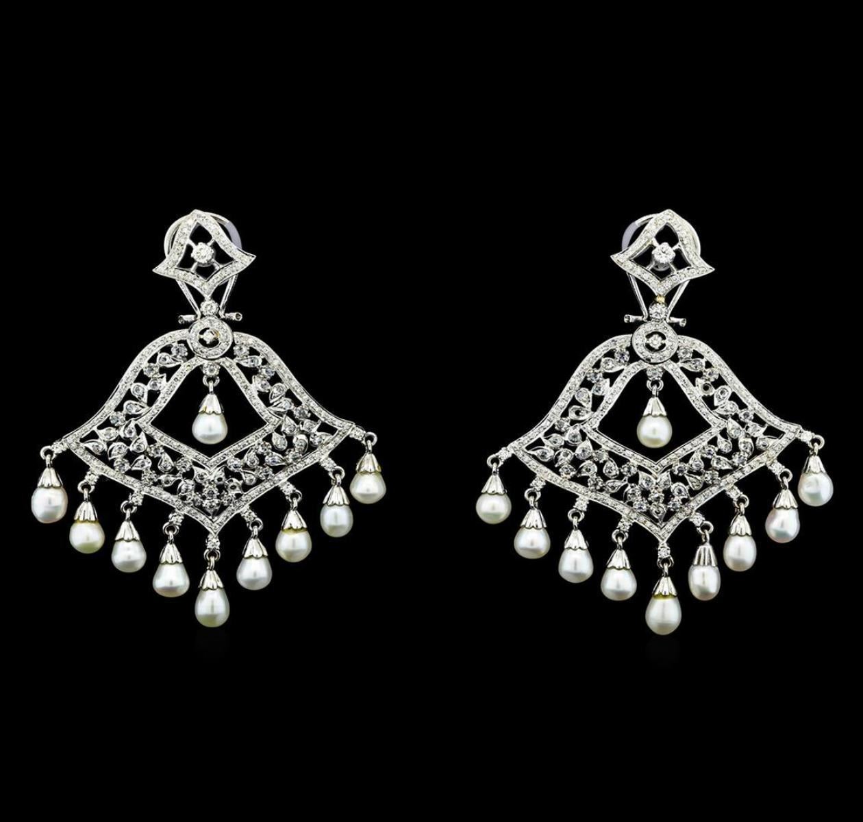 One pair electronically tested 14KT white gold lady's combination cast & assembled fashion chandelier earring with Omega clip backs with posts with a bright polish finish. The featured ladies earrings have 10 dangling round pearls with a dangle motif measuring 66 millimeters in length. Identified with markings of '14K'. Condition is new, good workmanship. Containing: Twenty Chinese freshwater pearls, 5.2mm to 5.0mm in size. The pearls are white in color with a good luster, pear, and mostly clean with very good matching. Graded in the setting. Two prong set round brilliant cut diamonds, measuring 3.00 - 2.90 x 1.80mm (depth est.) approximate total weight of 2 Stones = 0.20 ct. Graded in the setting. Clarity VS-2 to SI-1. Color: H - I Cut Very Good Twenty-Two prong set round brilliant cut diamonds, measuring 2.00 - 1.60 x 1.10mm (depth est.) approximate total weight of 22 Stones = 0.45ct. Graded in the setting. Clarity VS-1 to SI-1. Color: H - I Cut Good Ninety-Four prong set rose cut diamonds, measuring 2.00 - 1.60 x 1.00mm (depth est.) approximate total weight of 94 Stones = 1.30 ct. Graded in the setting. Clarity VS-2 to SI-1. Color: G - I Cut Good Two Hundred Eighty-Six pave' set round brilliant cut diamonds, measuring 1.00 - 0.95 x 0.60mm (depth est.) approximate total weight of 286 Stones = 1.00 ct. Graded in the setting. Clarity VS-1 to SI-1. Color: G - H Cut Good. Total Weight of Diamonds 2.95ct.. Total Weight of Chandelier Earring 29.70gm GAS Appraised.