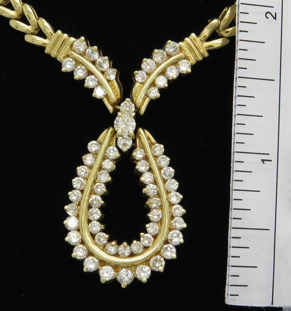 One tested 14K yellow gold diamond necklace. Containing: 62 Round Brilliant Cut Diamonds. Clarity: I-SI, Color: G-J. Approximate total diamond weight: 2.95CTW. Diamonds are graded in the mounting, unless otherwise stated. Weight: 32.4 grams, Size of chain: 15".