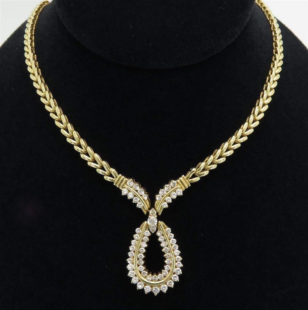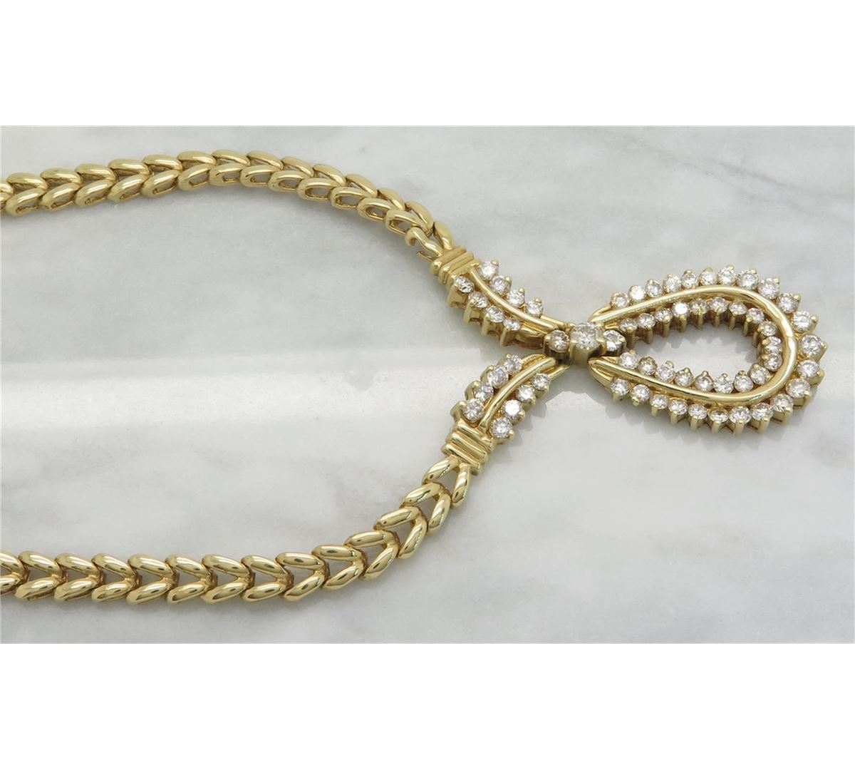 One tested 14K yellow gold diamond necklace. Containing: 62 Round Brilliant Cut Diamonds. Clarity: I-SI, Color: G-J. Approximate total diamond weight: 2.95CTW. Diamonds are graded in the mounting, unless otherwise stated. Weight: 32.4 grams, Size of chain: 15".