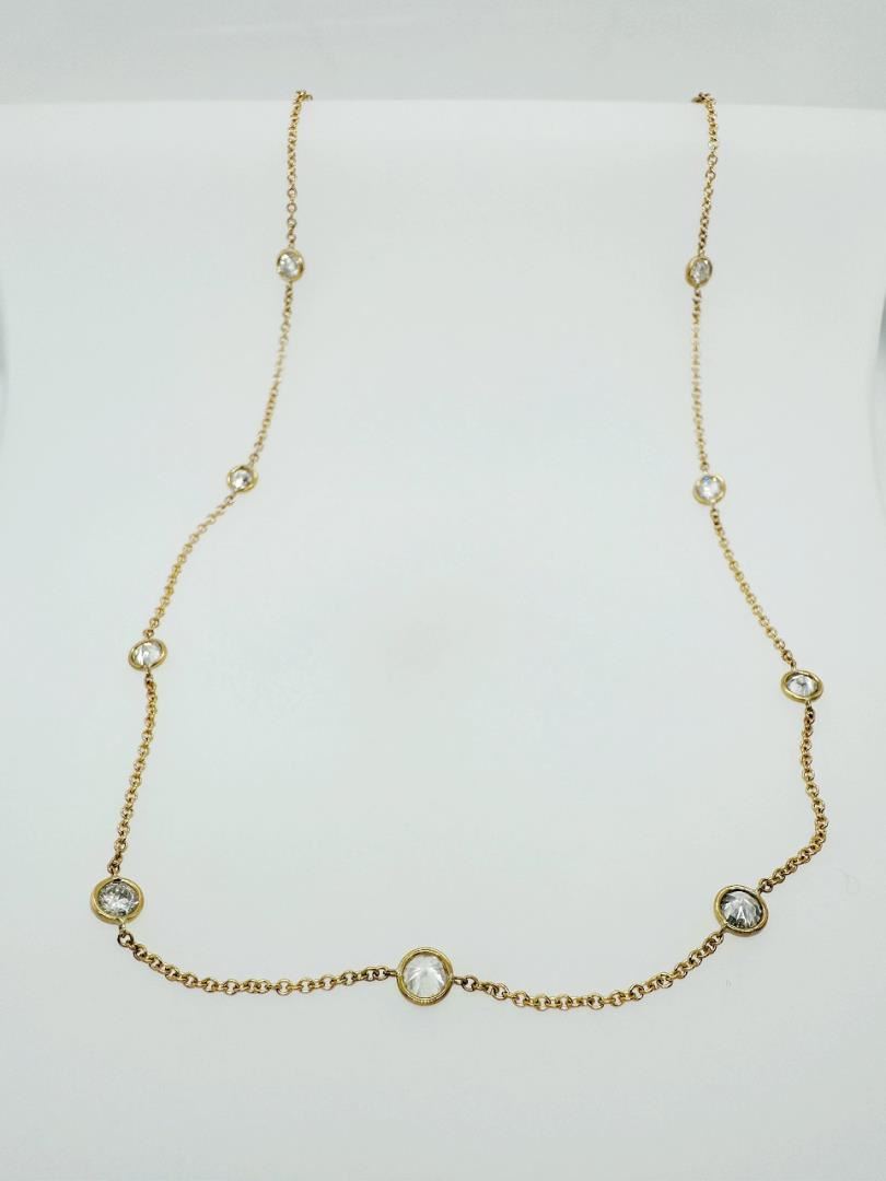 This exquisite 2.95 carat total weight "Diamonds by the Yard" necklace showcases a stunning series of round brilliant-cut diamonds, each delicately bezel-set along a sleek 18K yellow gold chain. The rich hue of the 18K yellow gold provides a warm contrast, enhancing the fire and brilliance of the diamonds. With its classic and refined design, this necklace offers versatility for both everyday wear and elegant occasions. Whether worn alone or layered, it radiates timeless elegance and adds a touch of luxury to any jewelry collection.