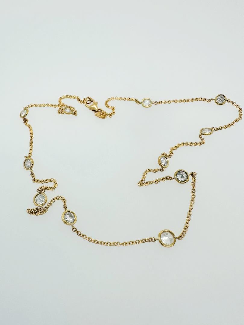 This exquisite 2.95 carat total weight "Diamonds by the Yard" necklace showcases a stunning series of round brilliant-cut diamonds, each delicately bezel-set along a sleek 18K yellow gold chain. The rich hue of the 18K yellow gold provides a warm contrast, enhancing the fire and brilliance of the diamonds. With its classic and refined design, this necklace offers versatility for both everyday wear and elegant occasions. Whether worn alone or layered, it radiates timeless elegance and adds a touch of luxury to any jewelry collection.