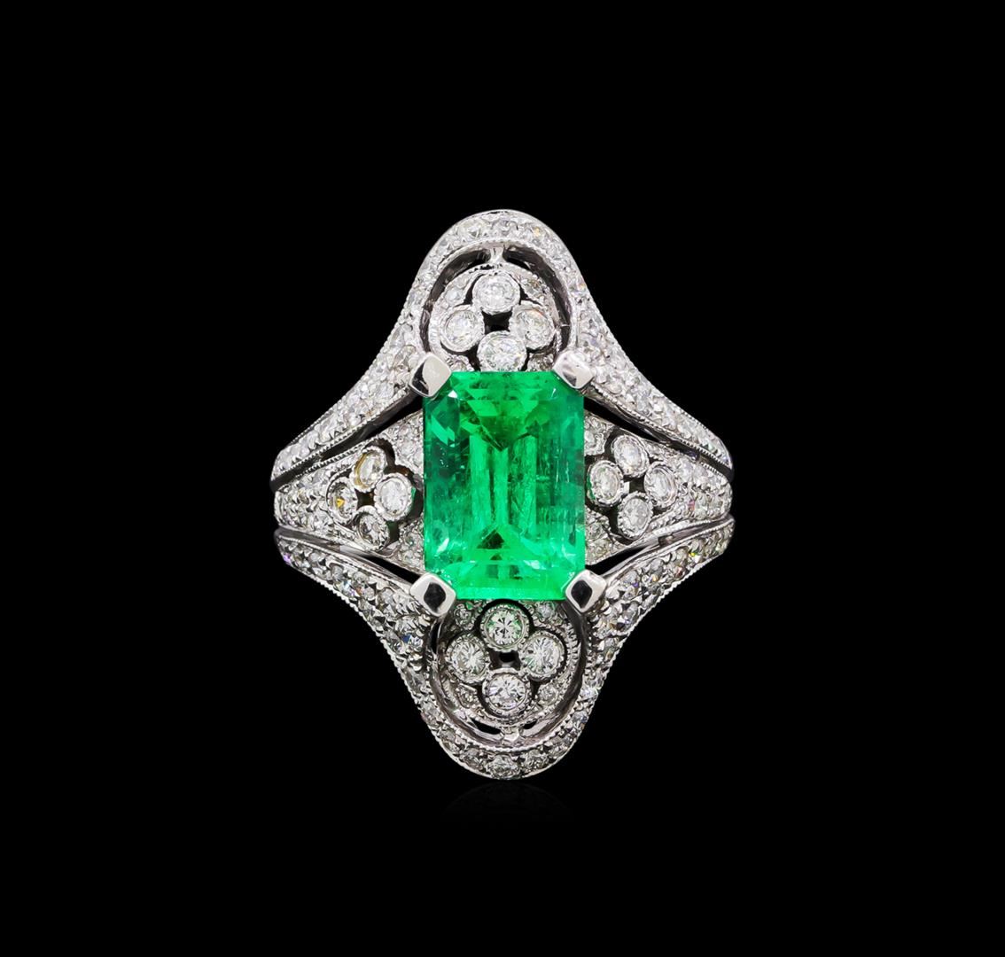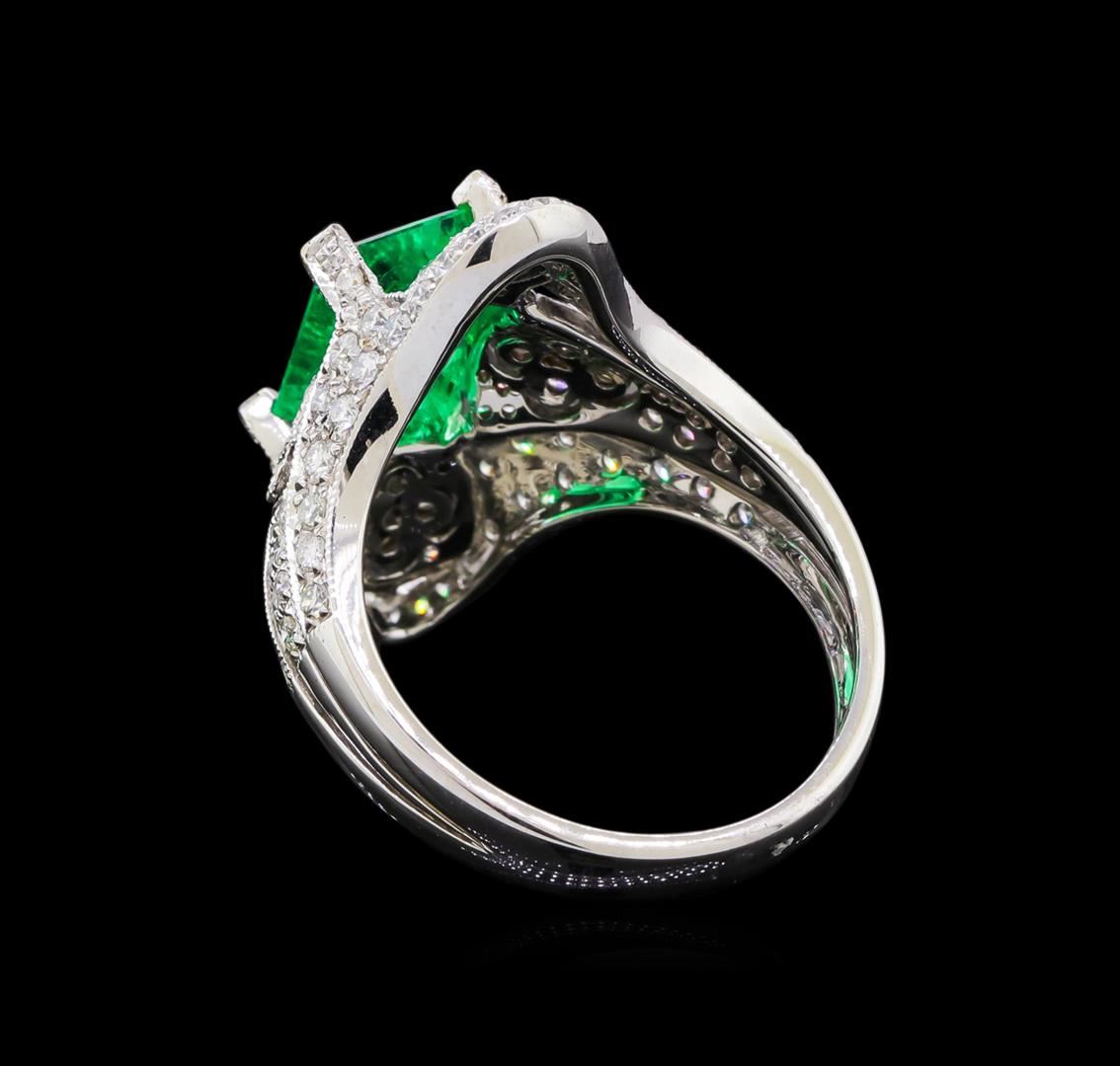One electronically tested 18KT white gold ladies cast emerald and diamond ring. The featured emerald is set within a stylized diamond cut-out gallery supported by three-way split shoulders, completed by a three millimeter wide band. Bright polish finish with milgrain detailing. Trademark is MICHA. Identified with markings of "18K 750". Condition is good. Containing: One prong set rectangular step cut natural emerald, measuring 9.90 x 7.00. x 5.60mm, approximate weight of 2.95ct., clarity is moderately included, type III, medium dark, moderately strong, very slightly bluish green color, (GIA vslbG 6/4), cut is good. Transmitting light with a minimum of distortion, transparent. Naturally occurring internal & external characteristics are present. Indications of oil residue. Graded in the setting. Twenty prong & bezel set round brilliant cut diamonds, measuring 1.60 - 1.50 x 0.93mm (depth est.) approximate total weight of 20 Stones = 0.30ct. Graded in the setting. Clarity: SI-1 to I-1 . Color: F - H Seventy prong set round brilliant cut diamonds, measuring 1.50 - 1.10 x 0.78mm (depth est.) approximate total weight of 70 Stones = 0.60ct. Graded in the setting. Clarity: SI-1 to I-1 . Color: F - H Twenty-Four prong set round brilliant cut diamonds, measuring 1.00. - 0.80 x 0.54mm (depth est.) approximate total weight of 24 Stones = 0.10ct. Graded in the setting. Clarity: SI-2 to I-2 . Color: F - H. Total Weight of Colored Stones 2.95ct.. Total Weight of Diamonds 1.00ct.. Total Weight of Ring 7.76gm. AIG Appraised at $10,910.00.