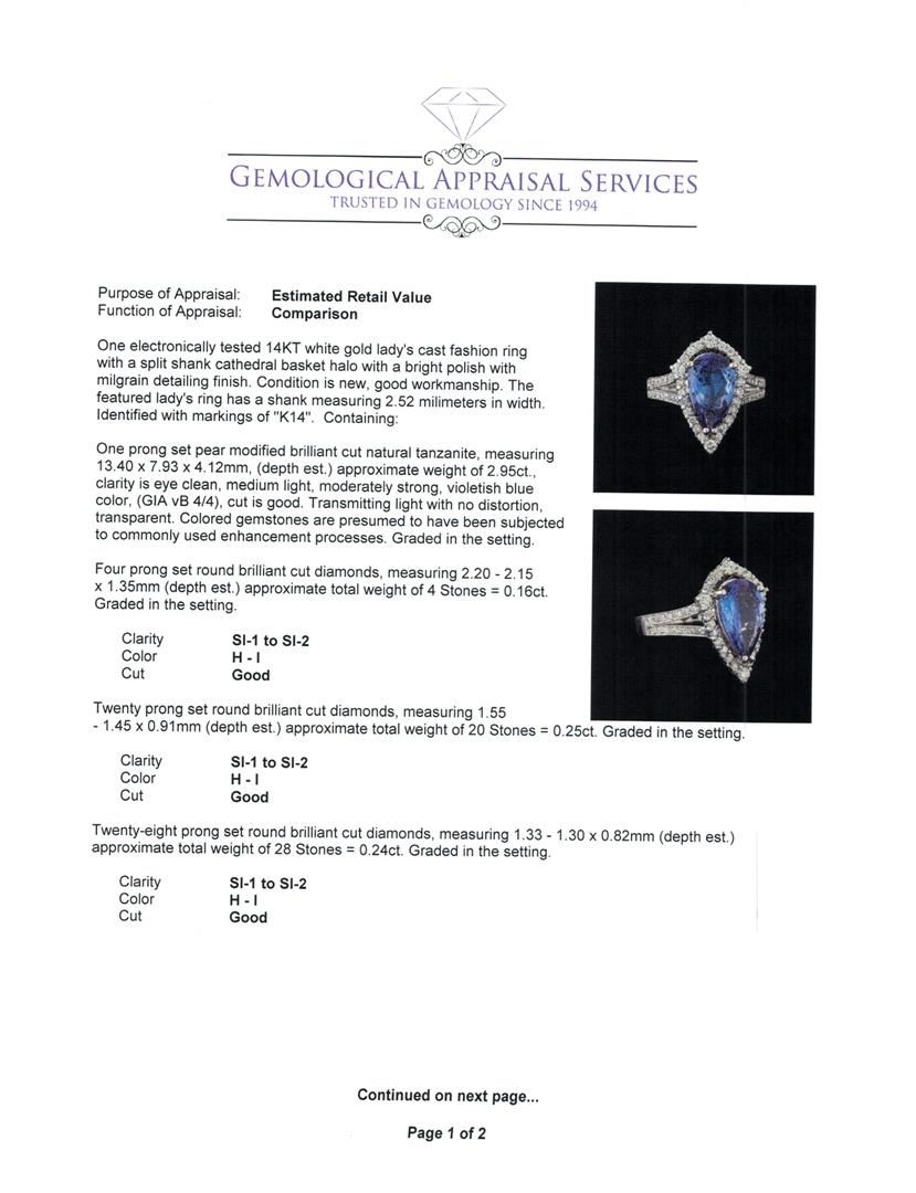 One electronically tested 14KT white gold lady's cast fashion ring with a split shank cathedral basket halo with a bright polish with milgrain detailing finish. The featured lady's ring has a shank measuring 2.52 millimeters in width. Identified with markings of 'K14'. Condition is new, good workmanship. Containing: One prong set pear modified brilliant cut natural tanzanite, measuring 13.40 x 7.93 x 4.12mm, (depth est.) approximate weight of 2.95ct., clarity is eye clean, medium light, moderately strong, violetish blue color, (GIA vB 4/4), cut is good. Transmitting light with no distortion, transparent. Colored gemstones are presumed to have been subjected to commonly used enhancement processes. Graded in the setting. Four prong set round brilliant cut diamonds, measuring 2.20 - 2.15 x 1.35mm (depth est.) approximate total weight of 4 Stones = 0.16ct. Graded in the setting. Clarity SI-1 to SI-2. Color: H - I Cut Good Twenty prong set round brilliant cut diamonds, measuring 1.55 - 1.45 x 0.91mm (depth est.) approximate total weight of 20 Stones = 0.25ct. Graded in the setting. Clarity SI-1 to SI-2. Color: H - I Cut Good Twenty-Eight prong set round brilliant cut diamonds, measuring 1.33 - 1.30 x 0.82mm (depth est.) approximate total weight of 28 Stones = 0.24ct. Graded in the setting. Clarity SI-1 to SI-2. Color: H - I Cut Good. Total Weight of Colored Stones 2.95ct.. Total Weight of Diamonds 0.65ct.. Total Weight of Ring 5.80gm. GAS Appraised at $5,880.00.