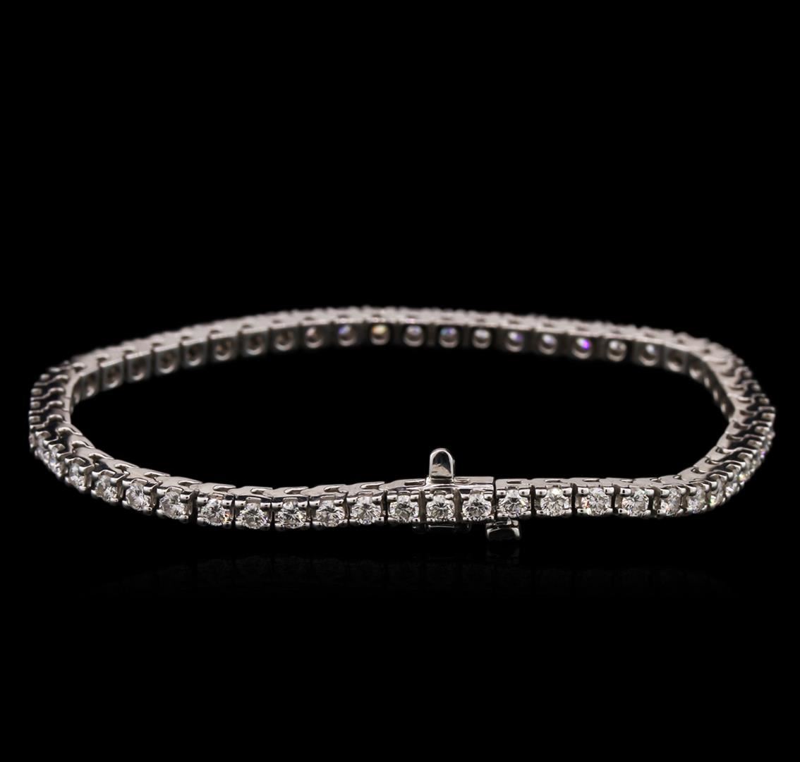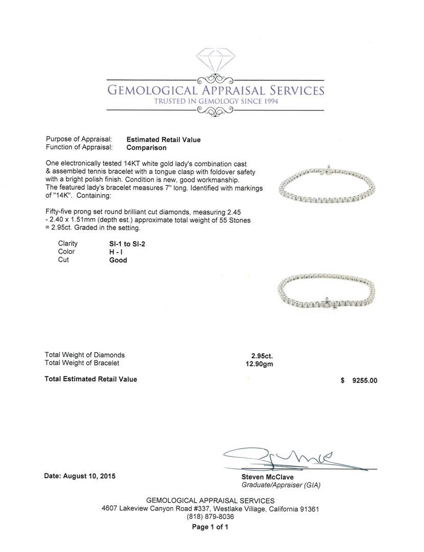 One electronically tested 14KT white gold lady's combination cast & assembled tennis bracelet with a tongue clasp with foldover safety with a bright polish finish. The featured lady's bracelet measures 7" long. Identified with markings of "14K". Condition is new, good workmanship. Containing: Fifty-Five prong set round brilliant cut diamonds, measuring 2.45 - 2.40 x 1.51mm (depth est.) approximate. Total Weight of 55 Stones = 2.95ct. Graded in the setting. Clarity: SI-1 to SI-2. Color: H - I. Cut Good. Total Weight of Diamonds 2.95ct. Total Weight of Bracelet 12.90gm. GAS Appraised at $9,255.00.