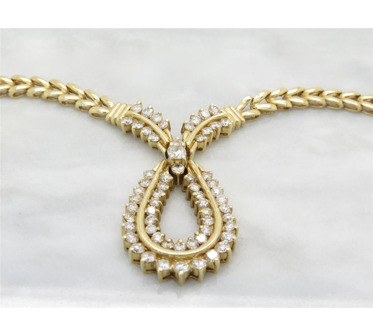 One tested 14K yellow gold diamond necklace. Containing: 62 Round Brilliant Cut Diamonds. Clarity: I-SI, Color: G-J. Approximate total diamond weight: 2.95CTW. Diamonds are graded in the mounting, unless otherwise stated. Weight: 32.4 grams, Size of chain: 15".