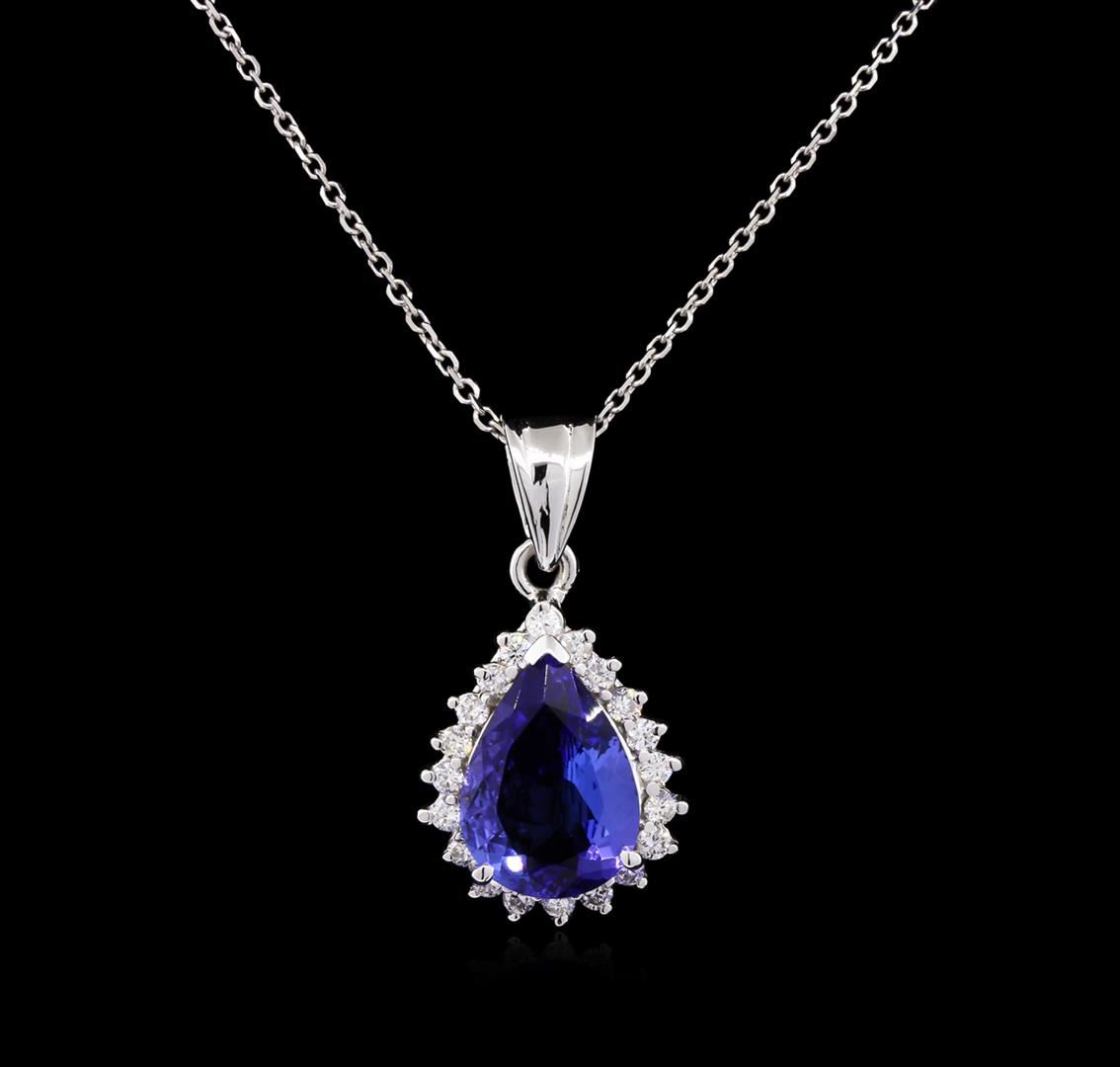 One electronically tested 14KT white gold lady's combination cast & assembled fashion pendant & chain 18.0" long, 1mm diamond cut cable link with a spring ring clasp with a bright polish finish. Identified with markings of "14K". Condition is new, good workmanship. Containing: One prong set pear modified brilliant cut natural tanzanite, measuring 12.80 x 9.02 x 4.14mm, approximate weight of 2.95ct., clarity is eye clean, type I, medium, very slightly grayish, bluish violet color, (GIA bV 5/3), cut is good. Transmitting light with no distortion, transparent. Colored gemstones are presumed to have been subjected to commonly used enhancement processes. Graded in the setting. Twenty prong set round brilliant cut diamonds, measuring 1.80 - 1.70 x 1.10mm (depth est.) approximate total weight of 20 Stones = 0.42ct. Graded in the setting. Clarity: VS-2 to SI-1. Color: G - I. Cut Good. Total Weight of Colored Stones 2.95ct. Total Weight of Diamonds 0.42ct. Total Weight of Pendant & Chain 5.20gm. GAS Appraised.