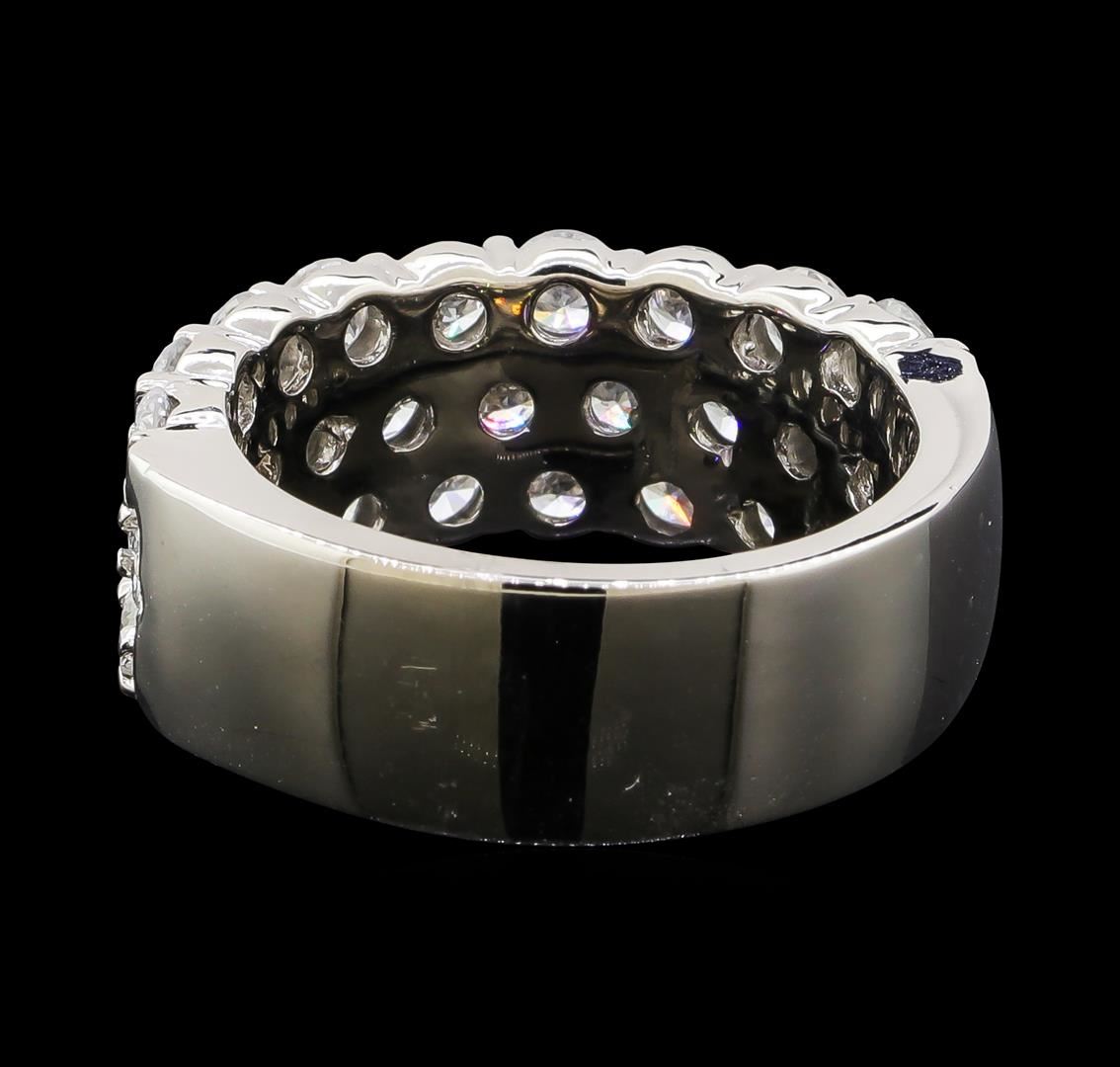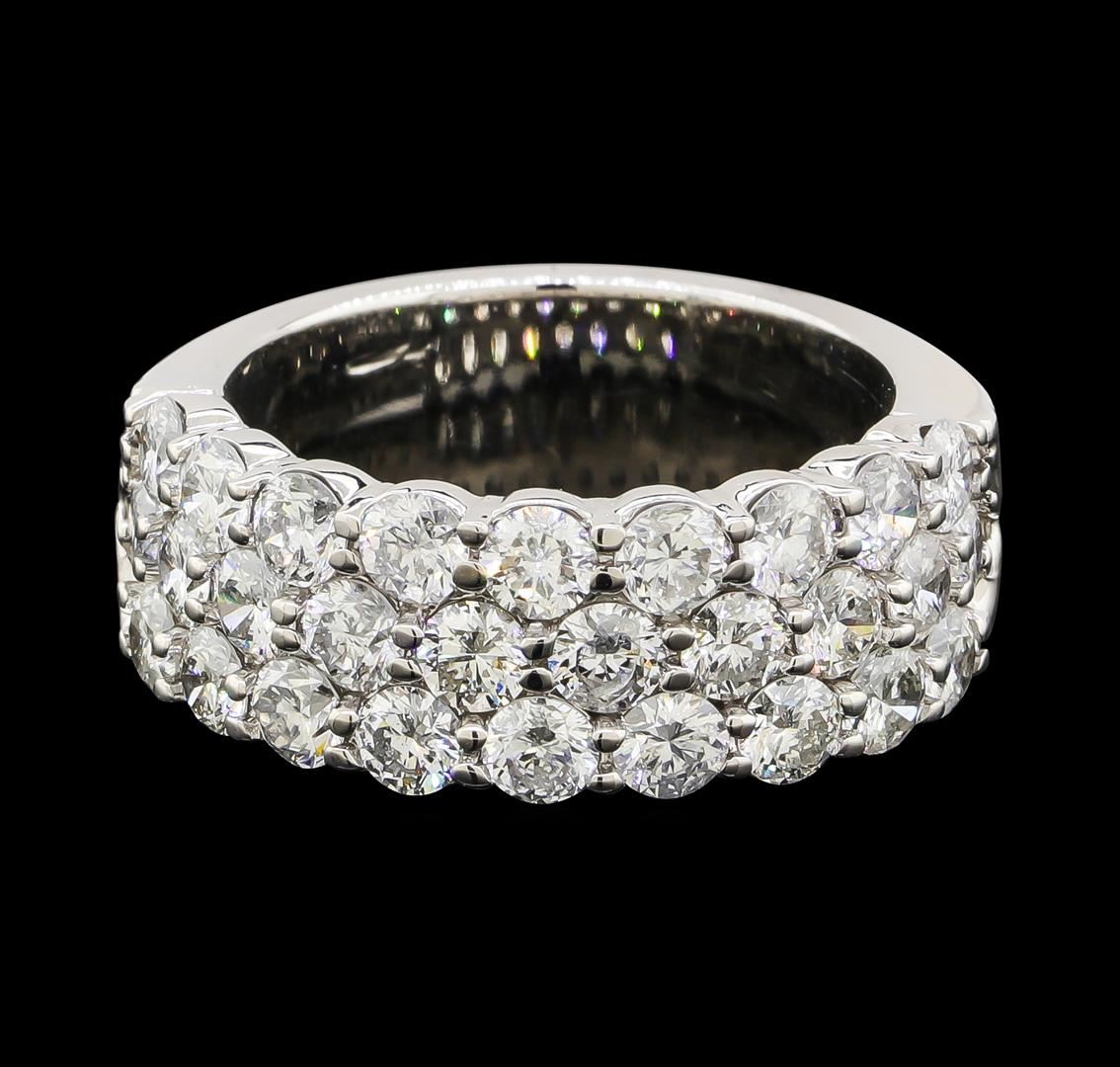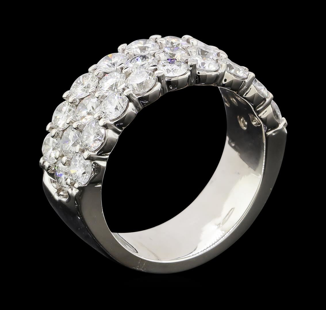 One electronically tested 14KT white gold lady's cast fashion ring with a three row wide band with a bright polish finish. The featured lady's ring has a shank measuring 7.19 millimeters wide. Identified with markings of '14K'. Condition is new, good workmanship. Containing: Twenty-Eight prong set round brilliant cut diamonds, measuring 3.10 - 3.00 x 1.86mm (depth est.) approximate total weight of 28 Stones = 2.96ct. Graded in the setting. Clarity SI-1 to I-1. Color: F - G Cut Good. Total Weight of Diamonds 2.96ct.. Total Weight of Ring 9.50gm. GAS Appraised at $7,990.00.