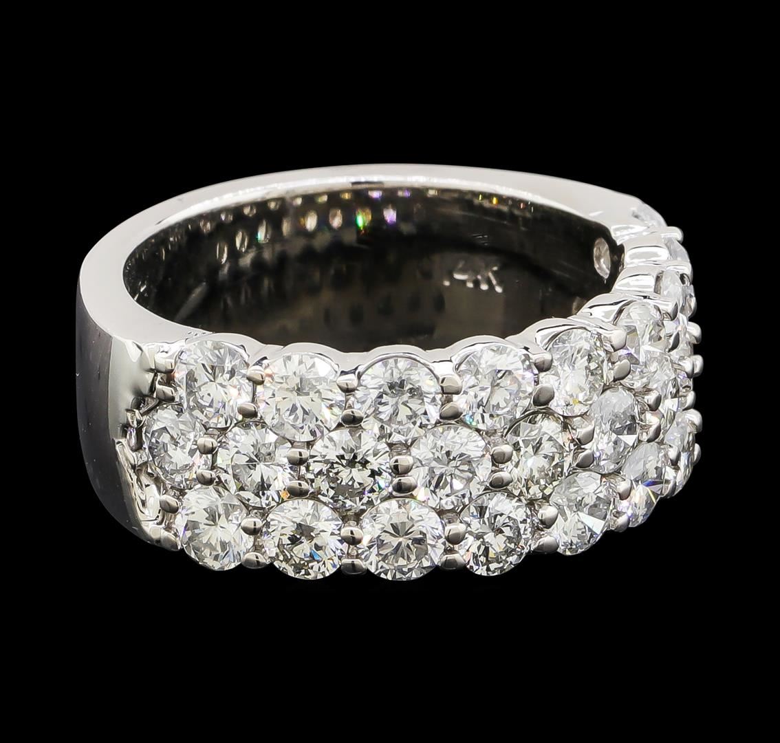 One electronically tested 14KT white gold lady's cast fashion ring with a three row wide band with a bright polish finish. The featured lady's ring has a shank measuring 7.19 millimeters wide. Identified with markings of '14K'. Condition is new, good workmanship. Containing: Twenty-Eight prong set round brilliant cut diamonds, measuring 3.10 - 3.00 x 1.86mm (depth est.) approximate total weight of 28 Stones = 2.96ct. Graded in the setting. Clarity SI-1 to I-1. Color: F - G Cut Good. Total Weight of Diamonds 2.96ct.. Total Weight of Ring 9.50gm. GAS Appraised at $7,990.00.