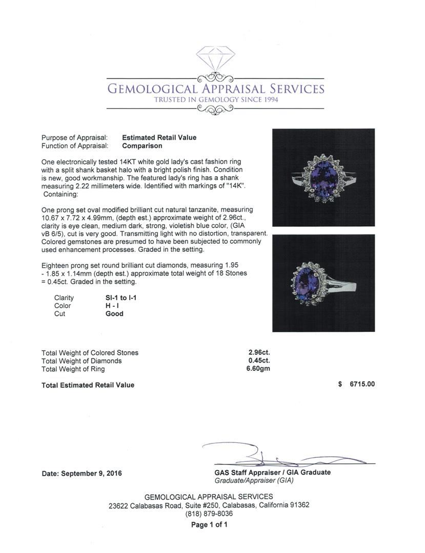 One electronically tested 14KT white gold lady's cast fashion ring with a split shank basket halo with a bright polish finish. The featured lady's ring has a shank measuring 2.22 millimeters wide. Identified with markings of '14K'. Condition is new, good workmanship. Containing: One prong set oval modified brilliant cut natural tanzanite, measuring 10.67 x 7.72 x 4.99mm, (depth est.) approximate weight of 2.96ct., clarity is eye clean, medium dark, strong, violetish blue color, (GIA vB 6/5), cut is very good. Transmitting light with no distortion, transparent. Colored gemstones are presumed to have been subjected to commonly used enhancement processes. Graded in the setting. Eighteen prong set round brilliant cut diamonds, measuring 1.95 - 1.85 x 1.14mm (depth est.) approximate total weight of 18 Stones = 0.45ct. Graded in the setting. Clarity SI-1 to I-1. Color: H - I Cut Good. Total Weight of Colored Stones 2.96ct.. Total Weight of Diamonds 0.45ct.. Total Weight of Ring 6.60gm GAS Appraised at $6,715.00.