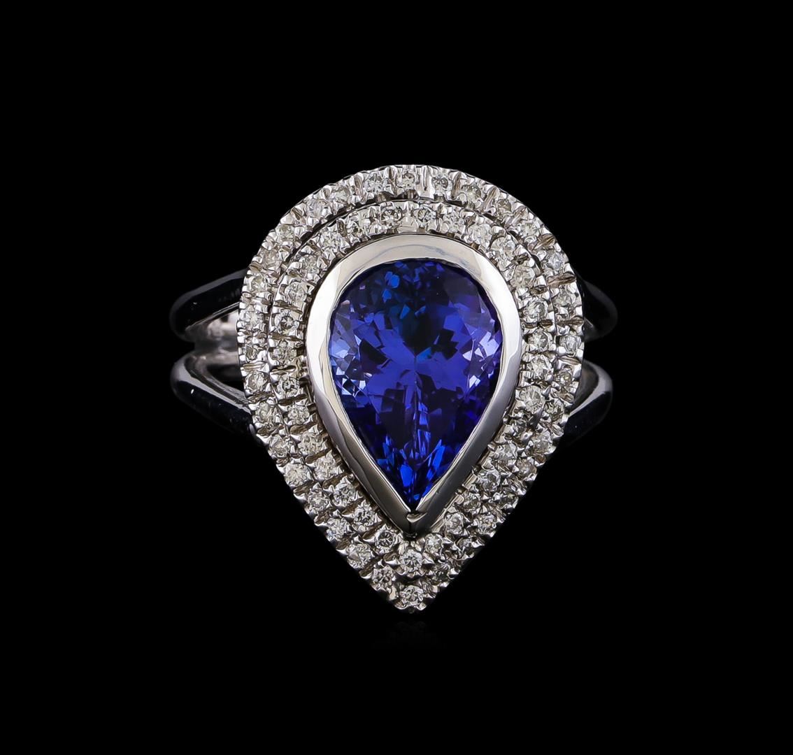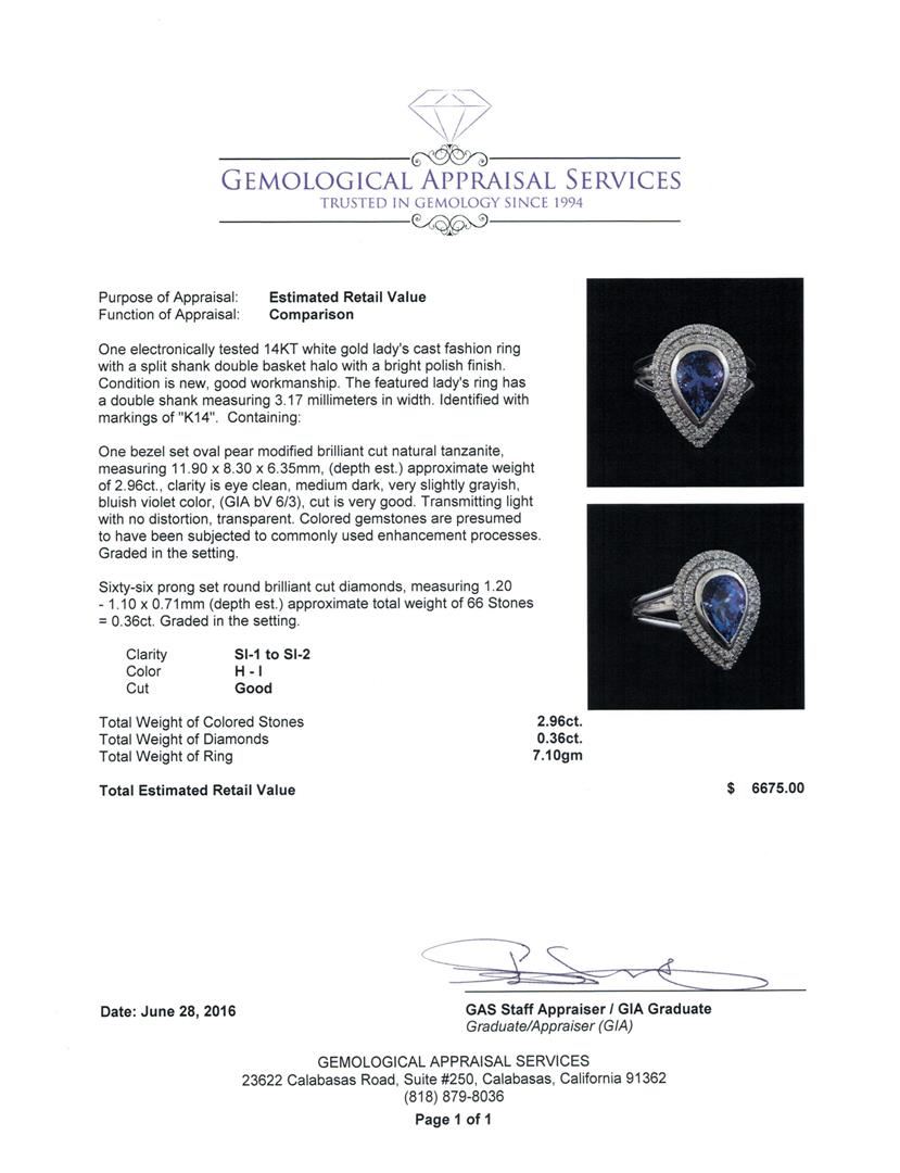 One electronically tested 14KT white gold lady's cast fashion ring with a split shank double basket halo with a bright polish finish. The featured lady's ring has a double shank measuring 3.17 millimeters in width. Identified with markings of "K14". Condition is new, good workmanship. Containing: One bezel set oval pear modified brilliant cut natural tanzanite, measuring 11.90 x 8.30 x 6.35mm, (depth est.) approximate weight of 2.96ct., clarity is eye clean, medium dark, very slightly grayish, bluish violet color, (GIA bV 6/3), cut is very good. Transmitting light with no distortion, transparent. Colored gemstones are presumed to have been subjected to commonly used enhancement processes. Graded in the setting. Sixty-Six prong set round brilliant cut diamonds, measuring 1.20 - 1.10 x 0.71mm (depth est.) approximate total weight of 66 Stones = 0.36ct. Graded in the setting. Clarity: SI-1 to SI-2. Color: H - I. Cut Good. Total Weight of Colored Stones 2.96ct. Total Weight of Diamonds 0.36ct. Total Weight of Ring 7.10gm. GAS Appraised at $6,675.00.