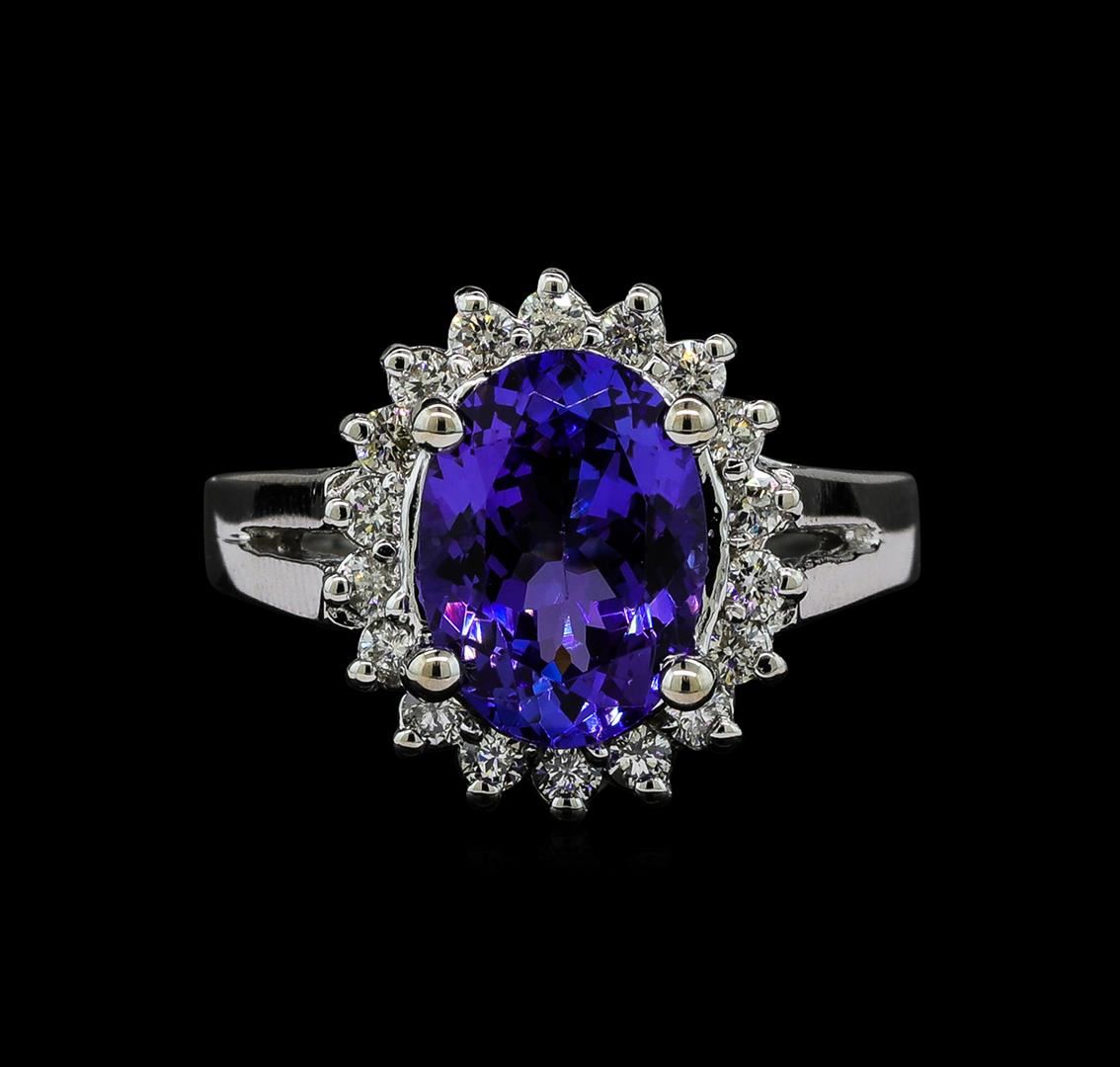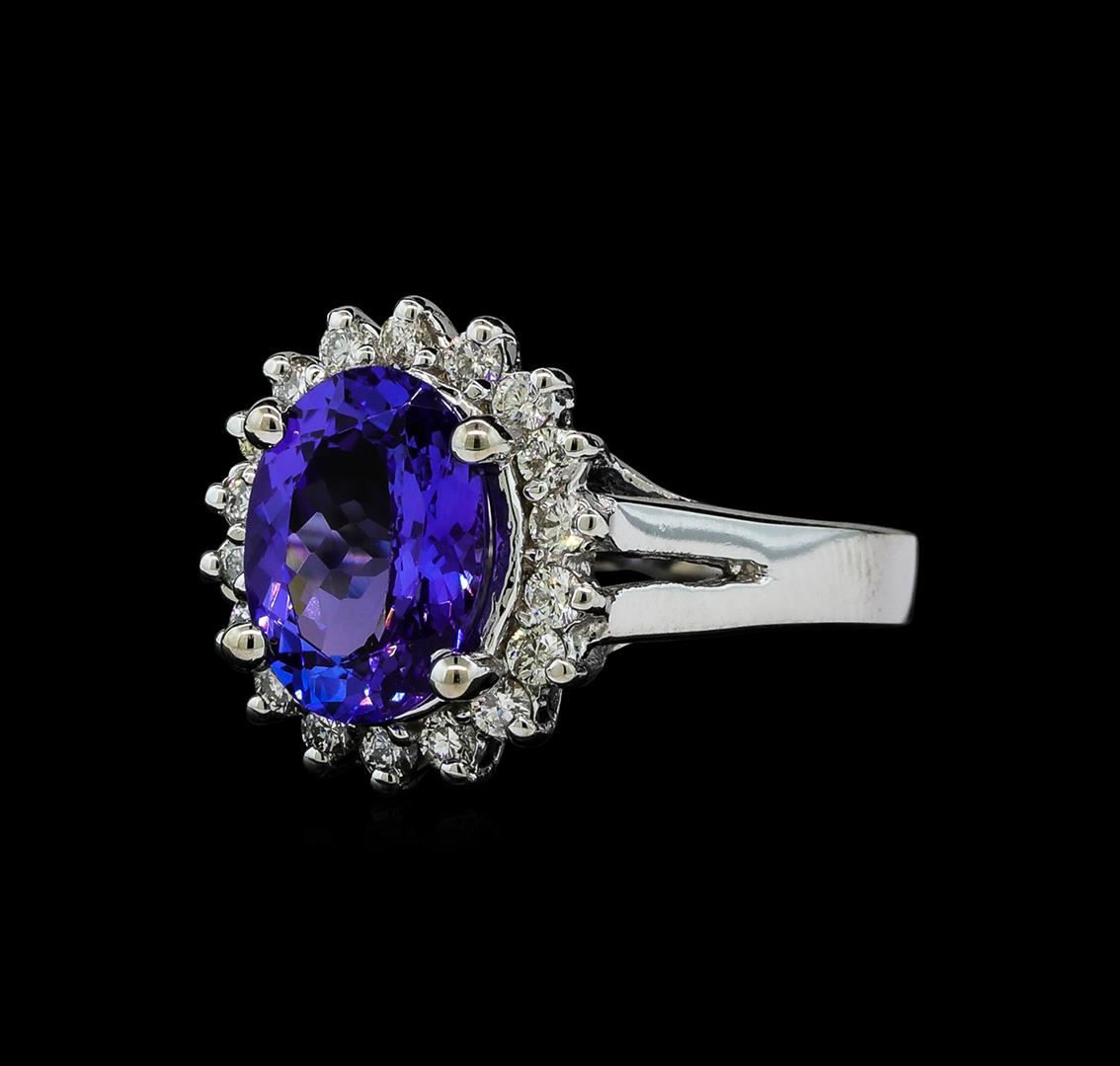One electronically tested 14KT white gold lady's cast fashion ring with a split shank basket halo with a bright polish finish. The featured lady's ring has a shank measuring 2.22 millimeters wide. Identified with markings of '14K'. Condition is new, good workmanship. Containing: One prong set oval modified brilliant cut natural tanzanite, measuring 10.67 x 7.72 x 4.99mm, (depth est.) approximate weight of 2.96ct., clarity is eye clean, medium dark, strong, violetish blue color, (GIA vB 6/5), cut is very good. Transmitting light with no distortion, transparent. Colored gemstones are presumed to have been subjected to commonly used enhancement processes. Graded in the setting. Eighteen prong set round brilliant cut diamonds, measuring 1.95 - 1.85 x 1.14mm (depth est.) approximate total weight of 18 Stones = 0.45ct. Graded in the setting. Clarity SI-1 to I-1. Color: H - I Cut Good. Total Weight of Colored Stones 2.96ct.. Total Weight of Diamonds 0.45ct.. Total Weight of Ring 6.60gm GAS Appraised at $6,715.00.
