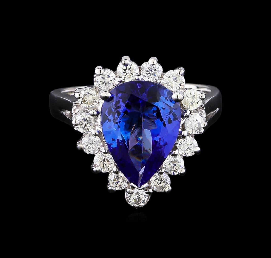 One electronically tested 14KT white gold lady's cast fashion ring with a basket halo with a bright polish finish. The featured lady's ring has a shank measuring 2.36 millimeters wide. Identified with markings of "14K". Condition is new, good workmanship. Containing: One prong set pear modified brilliant cut natural tanzanite, measuring 11.80 x 8.60 x 4.45mm, (depth est.) approximate weight of 2.96ct., clarity is eye clean, medium, moderately strong, violetish blue color, (GIA vB 5/4), cut is very good. Transmitting light with no distortion, transparent. Colored gemstones are presumed to have been subjected to commonly used enhancement processes. Graded in the setting. Fifteen prong set round brilliant cut diamonds, measuring 2.30 - 2.20 x 1.40mm (depth est.) approximate total weight of 15 Stones = 0.65ct. Graded in the setting. Clarity: SI-1 to SI-2. Color: G - Good. Total Weight of Colored Stones 2.96ct. Total Weight of Diamonds 0.65ct. Total Weight of Ring 6.60gm GAS Appraised at $6,860.00.