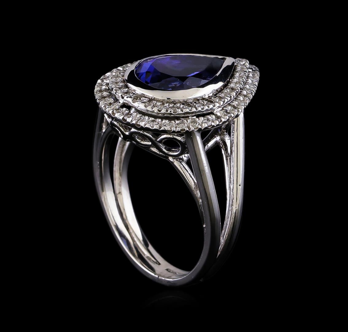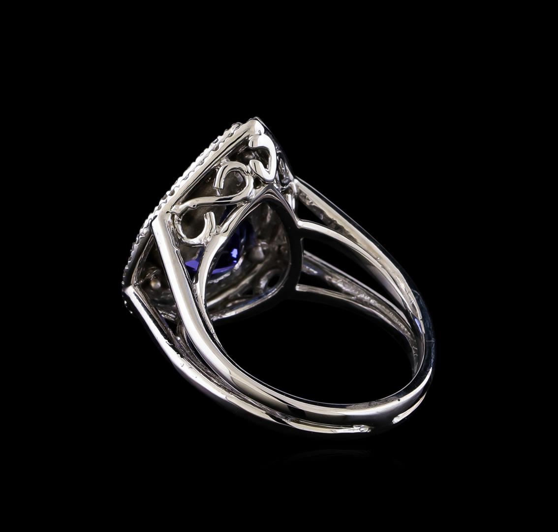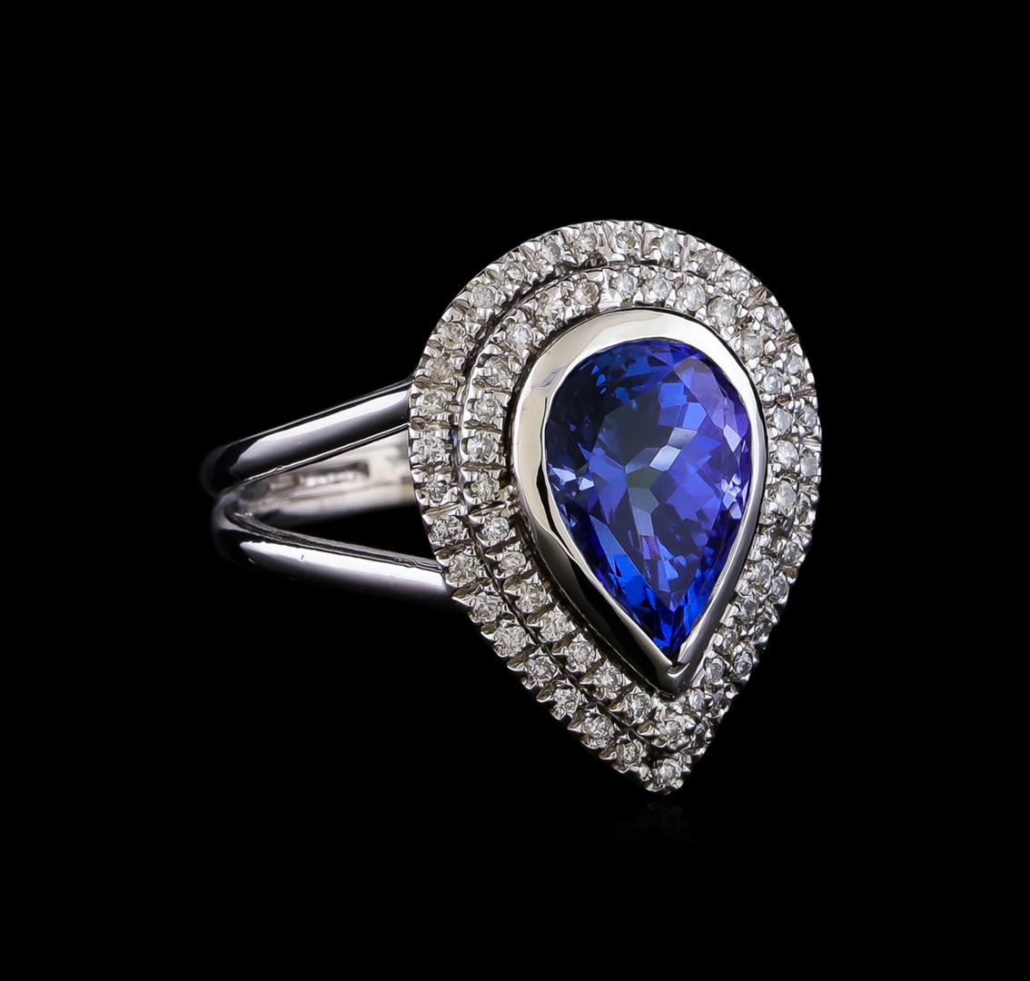 One electronically tested 14KT white gold lady's cast fashion ring with a split shank double basket halo with a bright polish finish. The featured lady's ring has a double shank measuring 3.17 millimeters in width. Identified with markings of "K14". Condition is new, good workmanship. Containing: One bezel set oval pear modified brilliant cut natural tanzanite, measuring 11.90 x 8.30 x 6.35mm, (depth est.) approximate weight of 2.96ct., clarity is eye clean, medium dark, very slightly grayish, bluish violet color, (GIA bV 6/3), cut is very good. Transmitting light with no distortion, transparent. Colored gemstones are presumed to have been subjected to commonly used enhancement processes. Graded in the setting. Sixty-Six prong set round brilliant cut diamonds, measuring 1.20 - 1.10 x 0.71mm (depth est.) approximate total weight of 66 Stones = 0.36ct. Graded in the setting. Clarity: SI-1 to SI-2. Color: H - I. Cut Good. Total Weight of Colored Stones 2.96ct. Total Weight of Diamonds 0.36ct. Total Weight of Ring 7.10gm. GAS Appraised at $6,675.00.