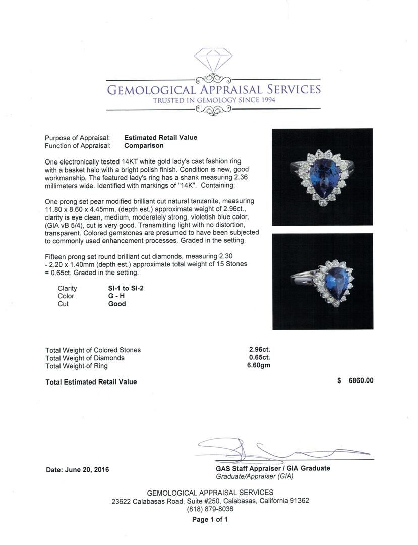 One electronically tested 14KT white gold lady's cast fashion ring with a basket halo with a bright polish finish. The featured lady's ring has a shank measuring 2.36 millimeters wide. Identified with markings of "14K". Condition is new, good workmanship. Containing: One prong set pear modified brilliant cut natural tanzanite, measuring 11.80 x 8.60 x 4.45mm, (depth est.) approximate weight of 2.96ct., clarity is eye clean, medium, moderately strong, violetish blue color, (GIA vB 5/4), cut is very good. Transmitting light with no distortion, transparent. Colored gemstones are presumed to have been subjected to commonly used enhancement processes. Graded in the setting. Fifteen prong set round brilliant cut diamonds, measuring 2.30 - 2.20 x 1.40mm (depth est.) approximate total weight of 15 Stones = 0.65ct. Graded in the setting. Clarity: SI-1 to SI-2. Color: G - Good. Total Weight of Colored Stones 2.96ct. Total Weight of Diamonds 0.65ct. Total Weight of Ring 6.60gm GAS Appraised at $6,860.00.