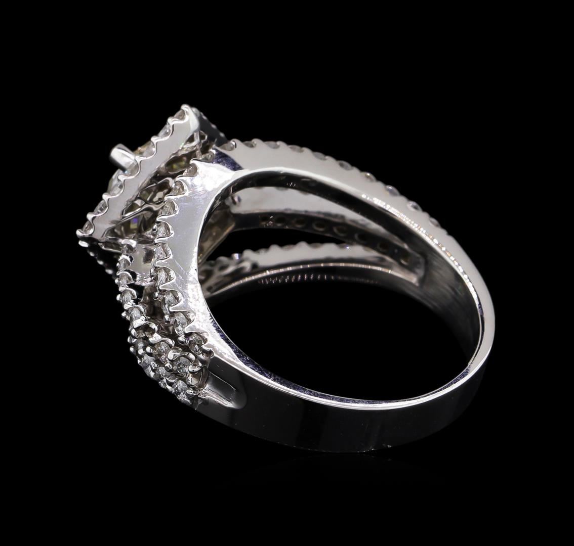 One electronically tested 14KT white gold ladies cast diamond unity ring with a bright polish finish. The featured diamond is set within a diamond bezel supported by diamond set three-way split shoulders, completed by a three millimeter wide band. Identified with markings of "K14". Condition is new, good workmanship. Containing: One prong set round brilliant cut diamond, measuring 6.57 - 6.46 x 3.94mm exact weight 1.03ct. Measured loose prior to setting. Graded in the setting. Clarity: I-1. Color: 60.4%. Table 57.0%. Pavil. Depth%. 43.0%. Eighty prong set round brilliant cut diamonds, measuring 1.90 - 1.80 x 1.11mm (depth est.) approximate total weight of 80 Stones = 1.94ct. Graded in the setting. Clarity: SI-2 to I-2. Color: G - H. Total Weight of Diamonds 2.97ct. Total Weight of Ring 6.20gm. AIG Appraised at $15,790.00.