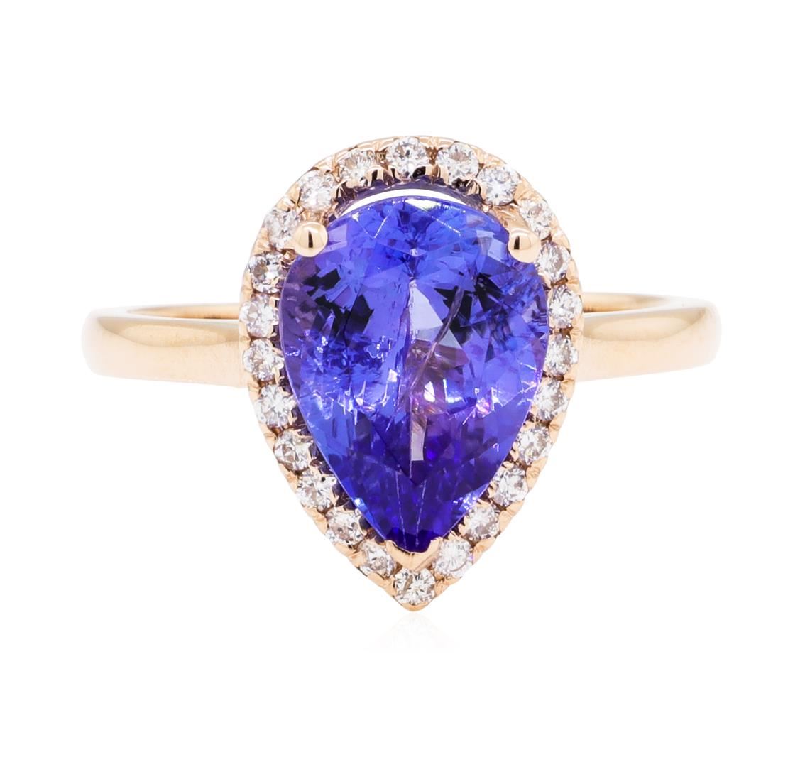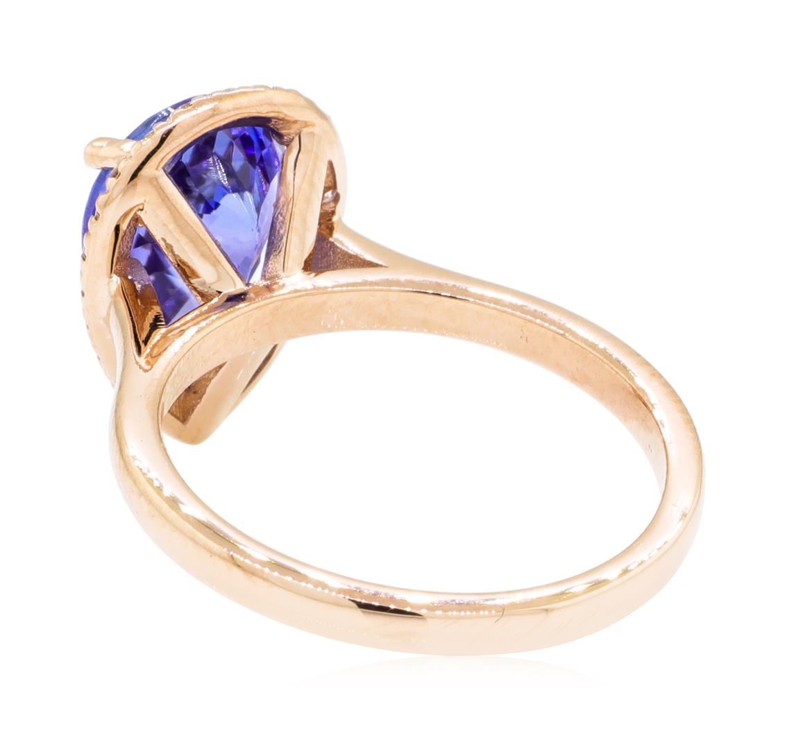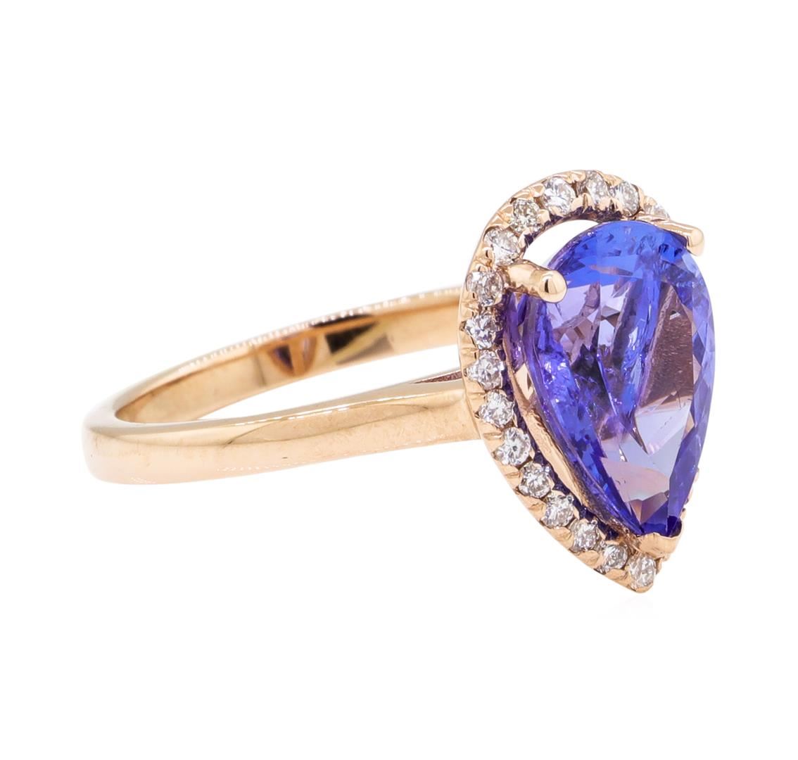 One electronically tested 14KT rose gold lady's cast fashion ring with a basket halo with a bright polish finish. The featured lady's ring has a shank measuring 2.00 millimeters wide. Identified with markings of '14K'. Condition is new, good workmanship. Containing: One prong set pear modified brilliant cut natural tanzanite, measuring 11.20 x 8.15 x 5.43mm, (depth est.) approximate weight of 2.97ct., clarity is slightly included, medium dark, moderately strong, violetish blue color, (GIA vB 6/4), cut is very good. Colored gemstones are presumed to have been subjected to commonly used enhancement processes. Graded in the setting. Twenty-Four prong set round brilliant cut diamonds, measuring 1.30 - 1.25 x 0.79mm (depth est.) approximate total weight of 24 Stones = 0.19ct. Graded in the setting. Color H - I Clarity SI-1 to SI-2 Cut Good. Total Weight of Colored Stones 2.97ct.. Total Weight of Diamonds 0.19ct.. Total Weight of Ring 3.90gm GAS Appraised at $5080.00. GAS Appraised at $5,080.00.