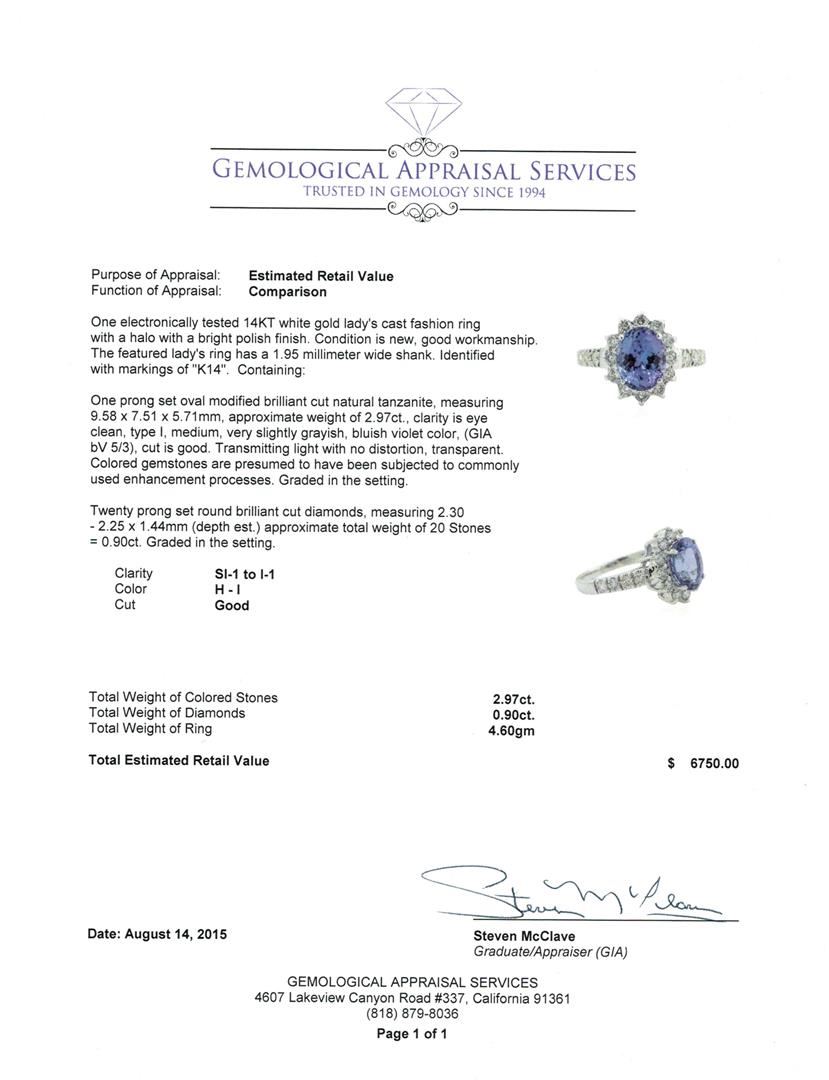 One electronically tested 14KT white gold lady's cast fashion ring with a halo with a bright polish finish. The featured lady's ring has a 1.95 millimeter wide shank. Identified with markings of "K14". Condition is new, good workmanship. Containing: One prong set oval modified brilliant cut natural tanzanite, measuring 9.58 x 7.51 x 5.71mm, approximate weight of 2.97ct., clarity is eye clean, type I, medium, very slightly grayish, bluish violet color, (GIA bV 5/3), cut is good. Transmitting light with no distortion, transparent. Colored gemstones are presumed to have been subjected to commonly used enhancement processes. Graded in the setting. Twenty prong set round brilliant cut diamonds, measuring 2.30 - 2.25 x 1.44mm (depth est.) approximate total weight of 20 Stones = 0.90ct. Graded in the setting. Clarity: SI-1 to I-1. Color: H - I. Cut Good. Total Weight of Colored Stones 2.97ct. Total Weight of Diamonds 0.90ct. Total Weight of Ring 4.60gm. GAS Appraised at $6,750.00.