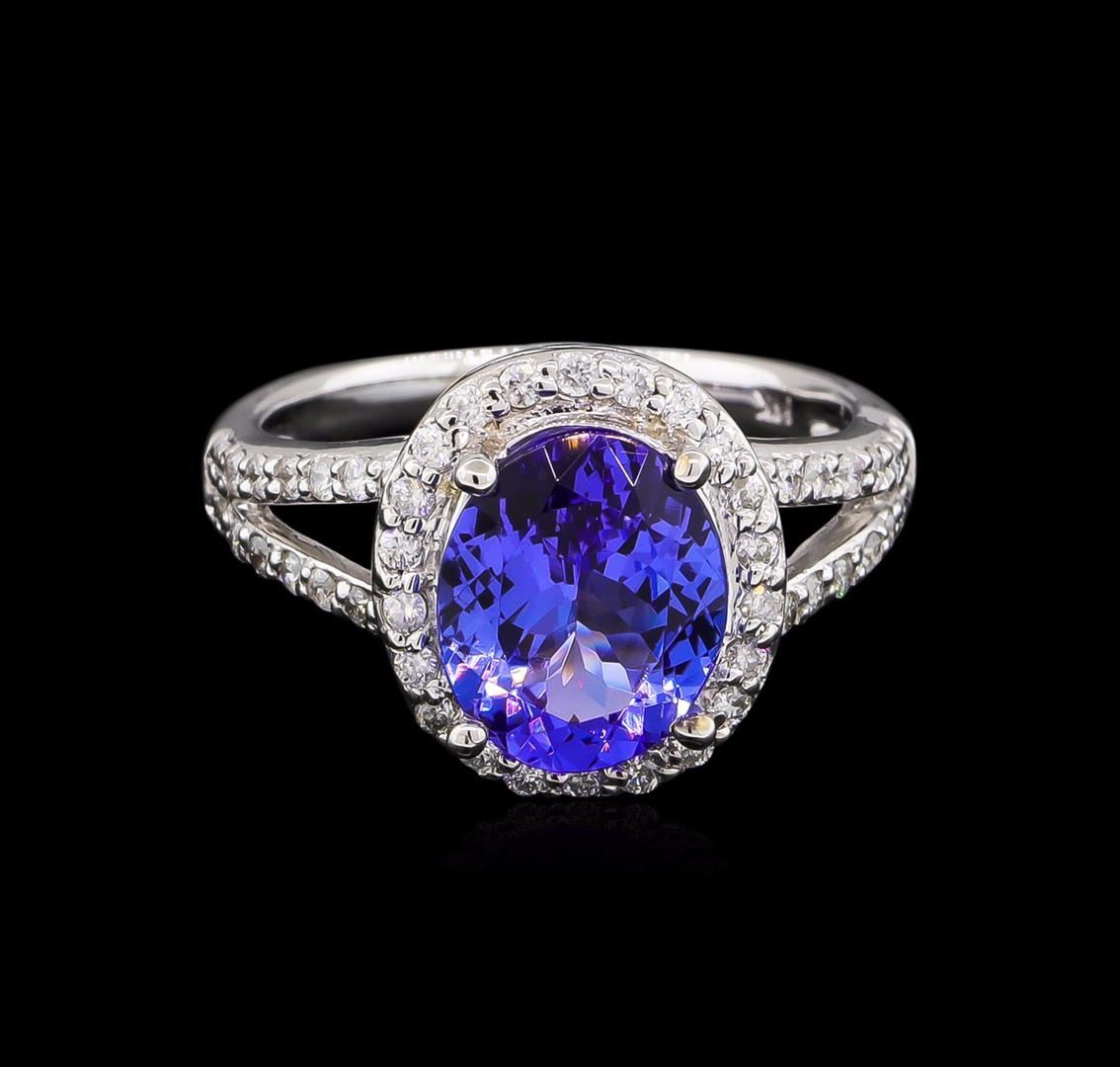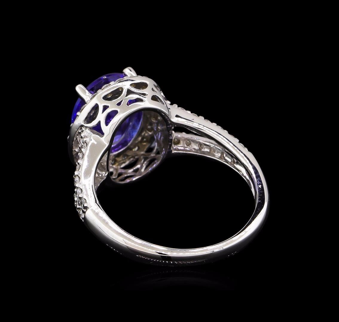 One electronically tested 14KT white gold lady's cast fashion ring with a split shank halo with a bright polish finish. The featured lady's ring has a shank measuring 2.32 millimeters wide. Identified with markings of "14K". Condition is new, good workmanship. Containing: One prong set oval modified brilliant cut natural tanzanite, measuring 10.47 x 8.48 x 4.84mm, approximate weight of 2.97ct., clarity is eye clean, type I, medium, moderately strong, violetish blue color, (GIA vB 5/4), cut is very good. Transmitting light with no distortion, transparent. Colored gemstones are presumed to have been subjected to commonly used enhancement processes. Graded in the setting. Fifty prong set round brilliant cut diamonds, measuring 1.40 - 1.35 x 0.84mm (depth est.) approximate total weight of 50 Stones = 0.48ct. Graded in the setting. Clarity: SI-1 to I-1. Color: G - I. Cut Good. Total Weight of Colored Stones 2.97ct. Total Weight of Diamonds 0.48ct. Total Weight of Ring 5.50gm. GAS Appraised at $6,480.00.
