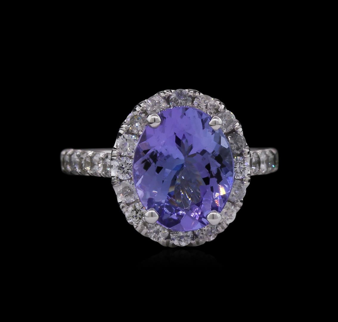 One electronically tested 14KT white gold lady's cast fashion ring with a cathedral shank with a halo with a bright polish finish. The featured lady's ring has a shank measuring 2.52 millimeters wide. Identified with markings of "14K". Condition is new, good workmanship. Containing: One prong set oval modified brilliant cut natural tanzanite, measuring 10.90 x 8.81 x 4.60mm, approximate weight of 2.97ct., clarity is eye clean, type I, medium light, very slightly grayish, bluish violet color, (GIA bV 4/3), cut is very good. Transmitting light with no distortion, transparent. Colored gemstones are presumed to have been subjected to commonly used enhancement processes. Graded in the setting. Thirty-Four prong set round brilliant cut diamonds, measuring 2.10 - 2.00 x 1.23mm (depth est.) approximate total weight of 34 Stones = 1.07ct. Graded in the setting. Clarity: SI-1 to I-1. Color: H - Good. Total Weight of Colored Stones 2.97ct. Total Weight of Diamonds 1.07ct. Total Weight of Ring 4.90gm. GAS Appraised at $5,495.00.