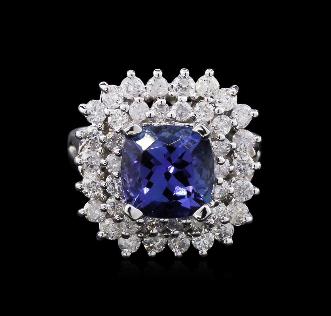 One electronically tested 14KT white gold ladies cast tanzanite and diamond ring with a bright polish finish. The featured tanzanite is set in a tiered diamond bezel, supported by a ribbed under gallery and split shoulders, completed by a two millimeter wide band. Identified with markings of "14K". Condition is new, good workmanship. Containing: One prong set square cushion mixed cut natural tanzanite, measuring 7.90 x 7.90 x 6.10mm, approximate weight of 2.97ct., clarity is eye clean, type I, medium, slightly grayish, violetish blue color, (GIA vB 5/2), cut is good. Transmitting light with no distortion, transparent. Graded in the setting. Tanzanite is a very rare gemstone that is only found in the country of Tanzania. Originally discovered in 1967. Tiffany & Company, named the stone Tanzanite. It is found in the Usumburu Mountains that border the Umba Valley of northern Tanzania. Tanzanite occurs in gray, brown, violet, blue, reddish-purple, & green. The gem is interesting because of its exceptional pleochroism. Rotated in different directions a tanzanite will exhibit multiple changes of color. Tanzanite has a low tolerance to ultrasonic cleaning, and should not be cleaned using this method. Forty prong set round brilliant cut diamonds, measuring 2.00 - 1.70 x 1.13mm (depth est.), 2.00.%. GTCF approximate total weight of 40 Stones = 1.11ct. Graded in the setting. Clarity: SI-2 to I-2. Color: G - H. Total Weight of Colored Stones 2.97ct. Total Weight of Diamonds 1.11ct. Total Weight of Ring 6.16gm. AIG Appraised at $9,135.00.